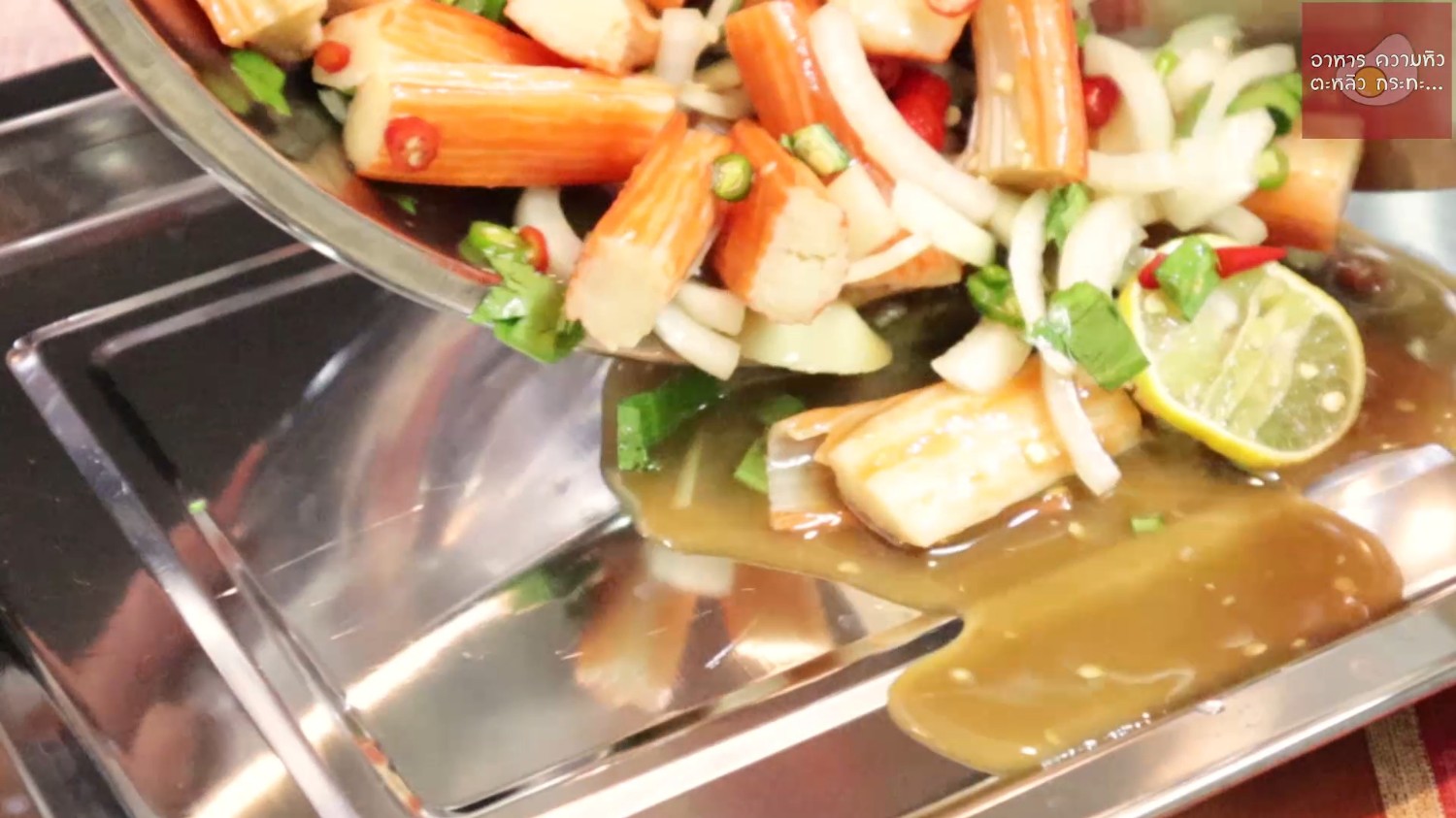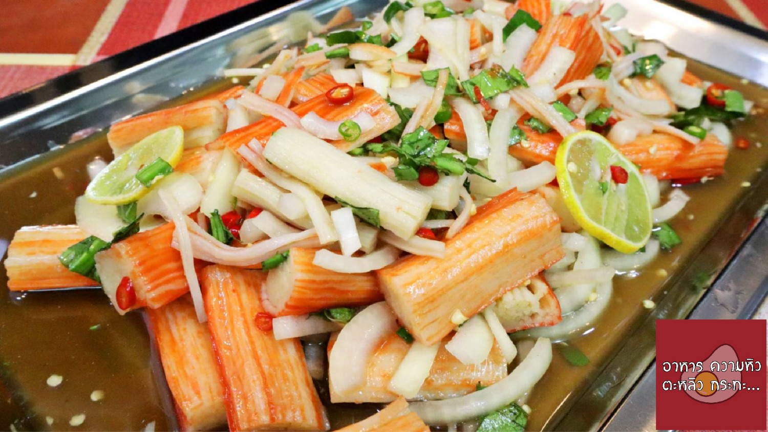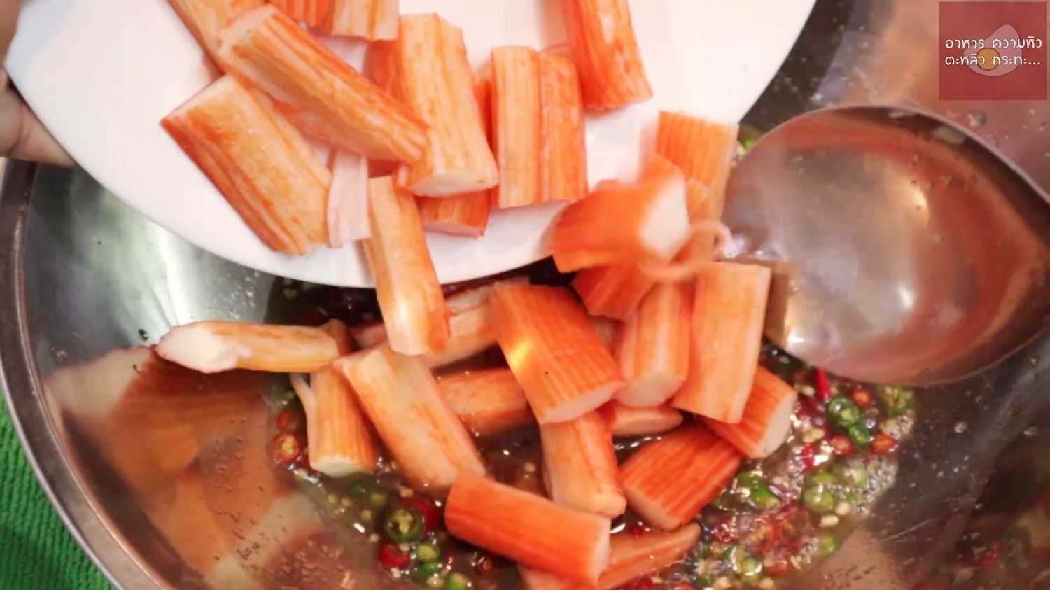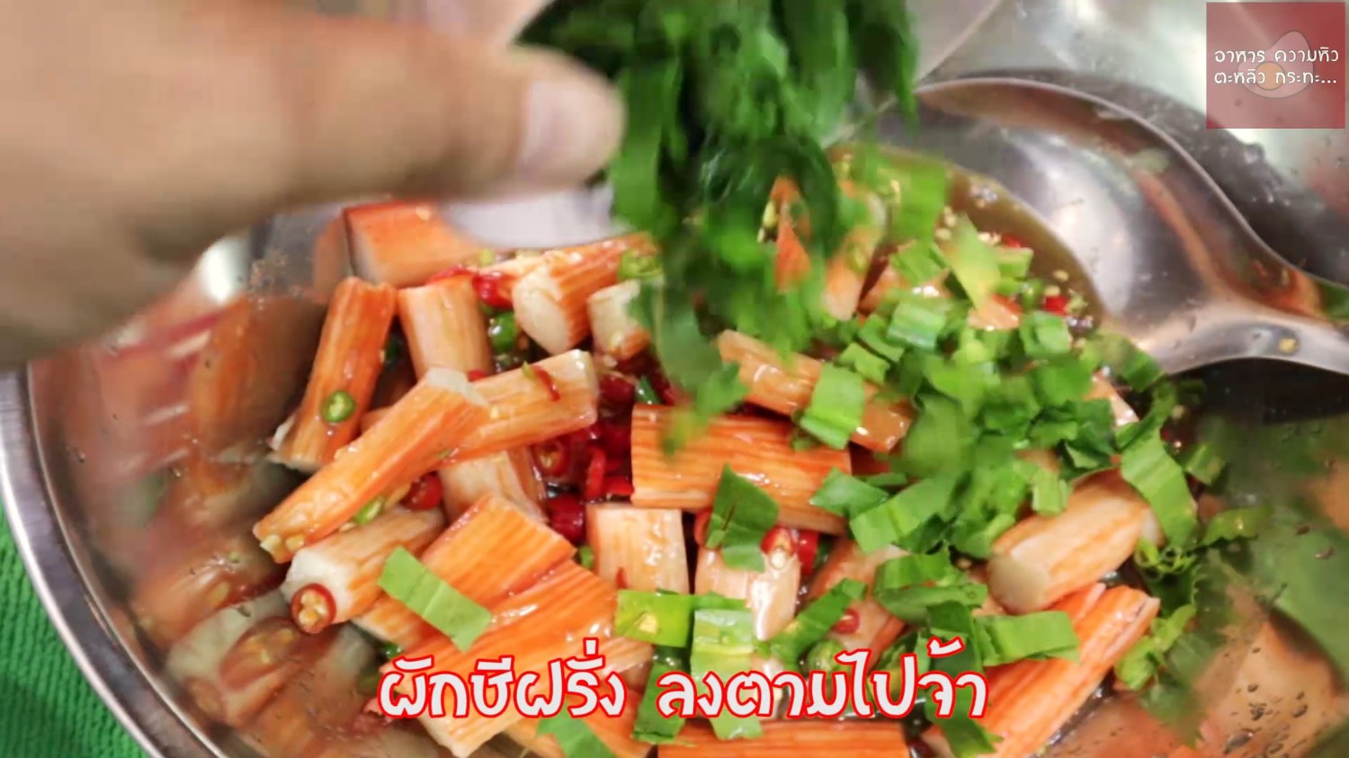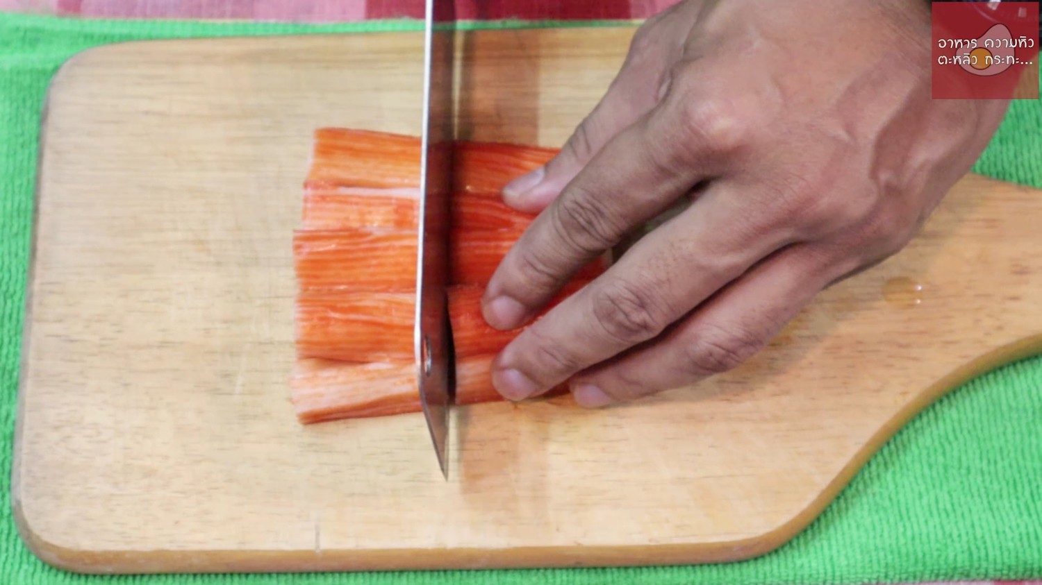 1.ก่อนอื่นก็หั่นปูอัดให้เป็นชิ้นๆ พอดีคำก่อนเลย เสร็จแล้วพักไว้ก่อนนะ