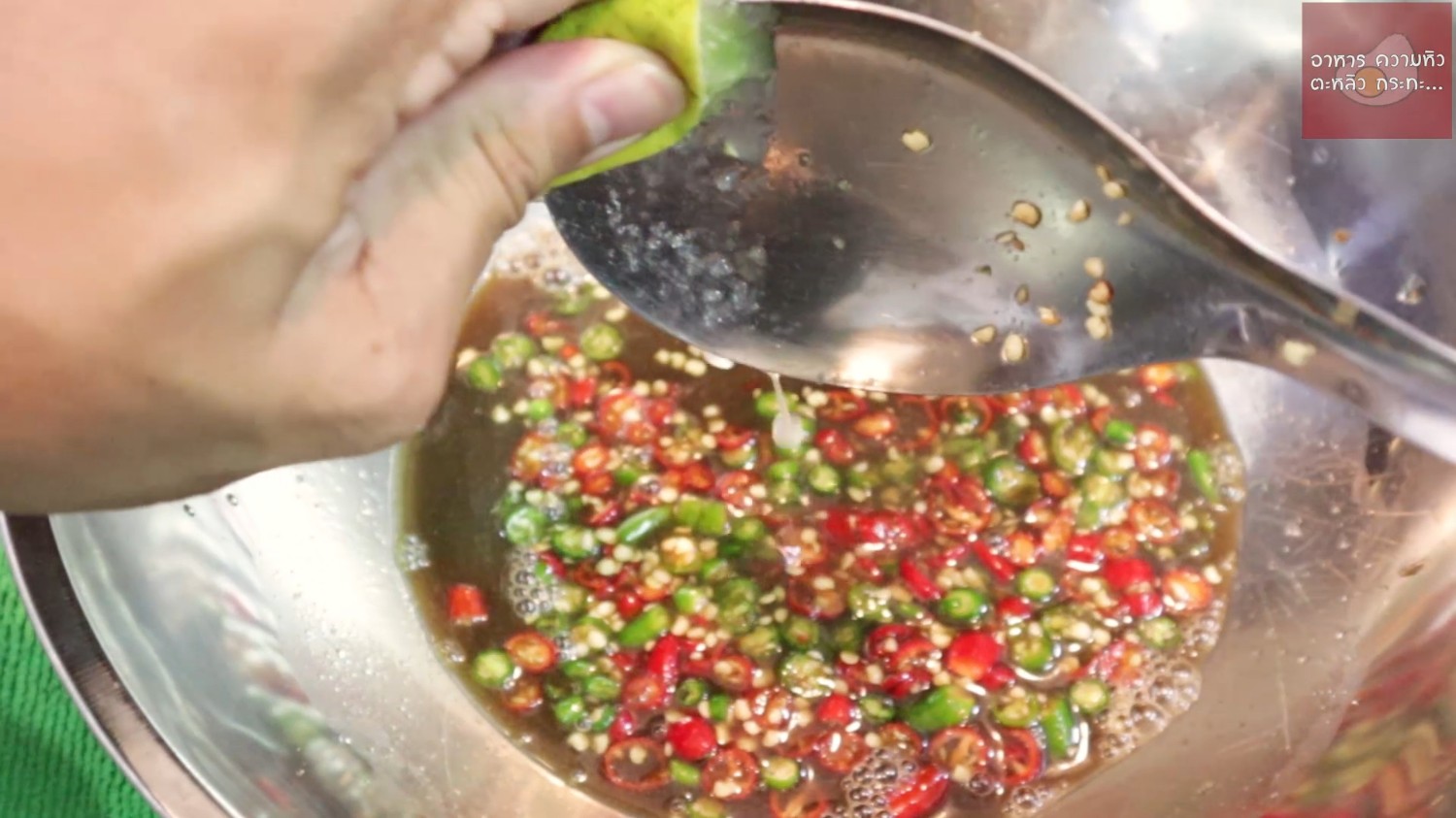 4.ใส่พริก , บีบมะนาว ลงไปแล้วคนให้เข้ากันเลยจ้า