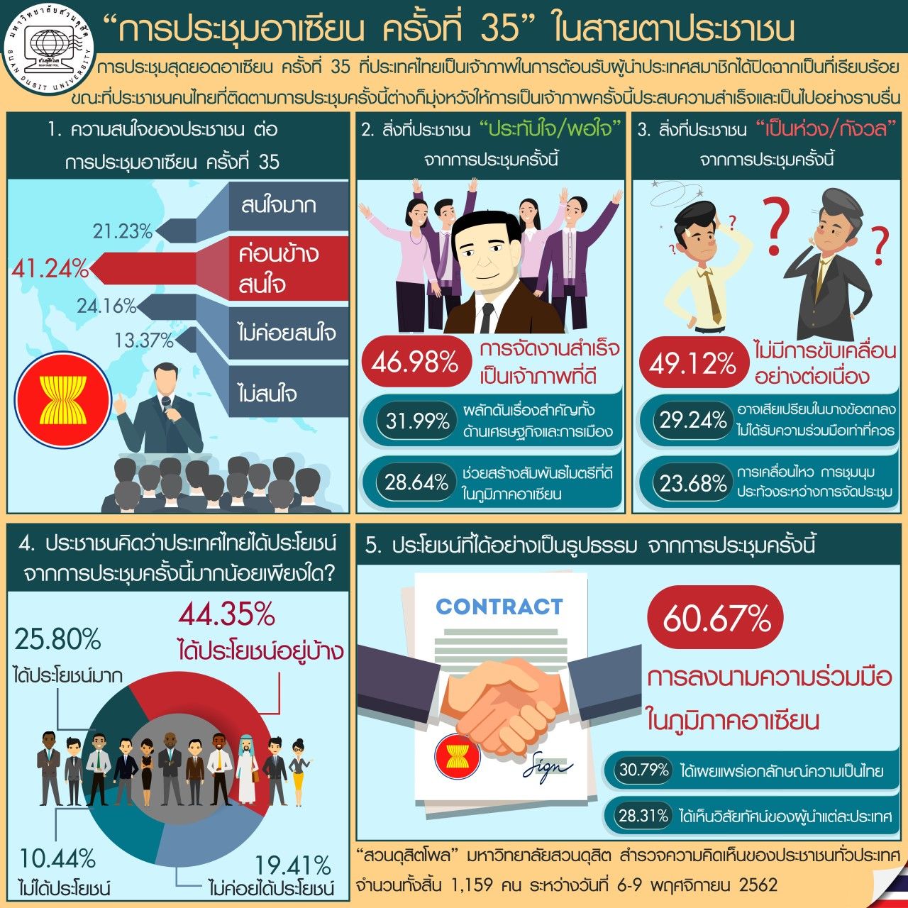 การประชุมสุดยอดอาเซียน ครั้งที่ 35 ที่ประเทศไทยเป็นเจ้าภาพในการต้อนรับผู้นําประเทศสมาชิกได้ปิดฉาก ขณะที่ประชาชนคนไทยที่ติดตามการประชุมครั้งนี้ต่างก็มุ่งหวังให้การเป็นเจ้าภาพครั้งน้ีประสบความสําเร็จ และเป็นไปอย่างราบรื่น เพื่อเป็นการสะท้อนความคิดเห็นของประชาชนที่มีต่อการจัดประชุมดังกล่าว “สวนดุสิตโพล” มหาวิทยาลัยสวนดุสิต จึงได้สํารวจความคิดเห็นของประชาชนทั่วประเทศ จํานวนทั้งสิ้น 1,159 คน ระหว่างวันที่ 6-9 พฟศจิกายน 2562 สรุปผลได้ ดังนี้