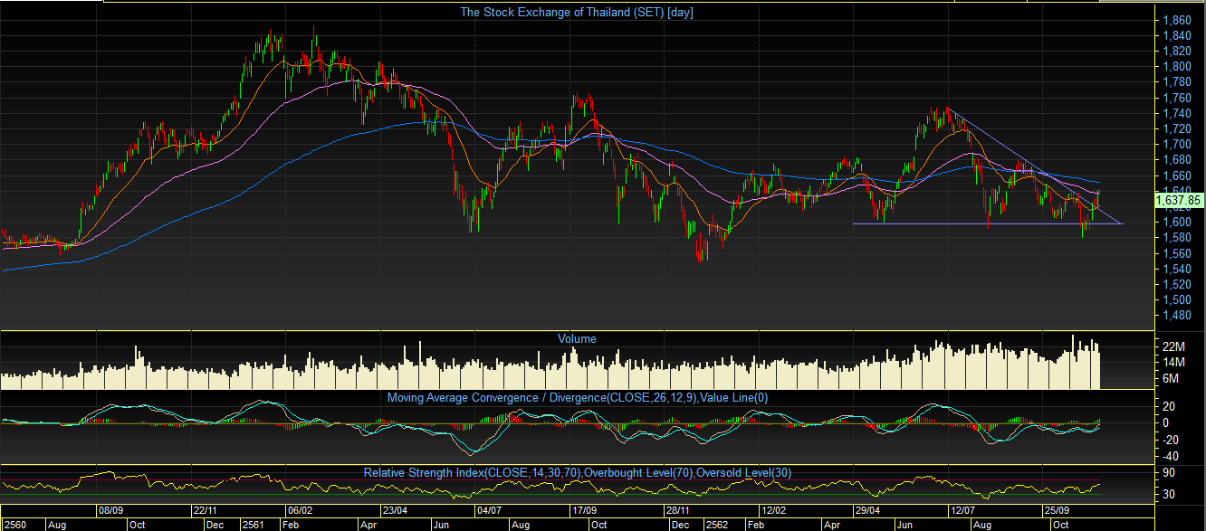 ประเทศ หลังคณะกรรมการกำหนดนโยบายการเงิน (กนง.) มีมติปรับลดอัตราดอกเบี้ยลงอีก 0.25% ลงมาสู่ระดับ 1.25 – 1.50% ต่ำที่สุดในรอบ 10 ปี นอกจากนั้ยังมีกระแสข่าวทางการจีน และ สหรัฐ เตรียมจะยกเลิกเก็บภาษีนำเข้าของแต่ล่ะฝ่าย ซึ่งทำให้บรรยากาศการลงทุน ค่อนข้างสดใส โดยตลอดทั้งสัปดาห์ ดัชนีตลาดหุ้นไทย บวกไปมากกว่า 30 จุด และวันศุกร์มีการอ่อนตัวลงมาเล็กน้อย ปิดที่ระดับ 1637 จุด -3.03 จุด วันนี้มาติดตามกันต่อ