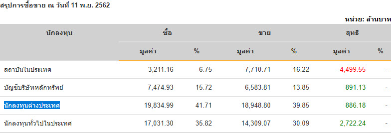 Sinthorn Summary 11/11/2562 : ต่างชาติซื้อสุทธิ 886.18 ลบ.