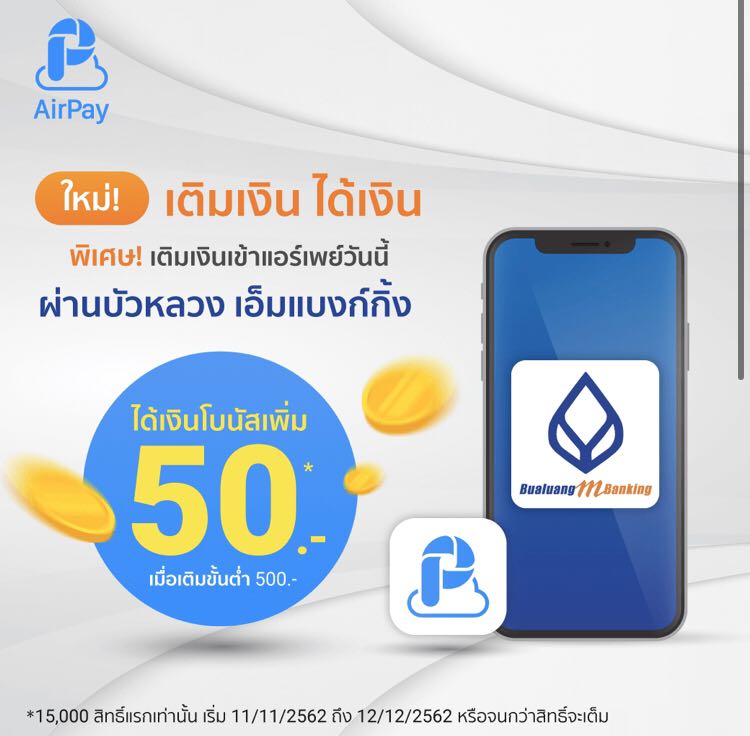วันนี้ 11.11.19 เป็นวันที่แต่ละเจ้าก็จะโปรโมทการขายของเต็มที่ และหนึ่งในนั้นคือ “Airpay” โดยมีโปรโมชั่น เติมเงินขั้นต่ำ 500 บาทผ่าน Bualuang M-bangking จะได้รับโบนัส 50 บาท ตามภาพ