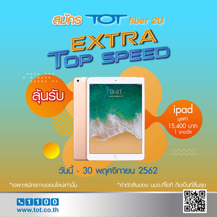 สมัคร TOT fiber 2U โปร Extra Top Speed ทางออนไลน์ ลุ้นรับ iPad ฟรี!!