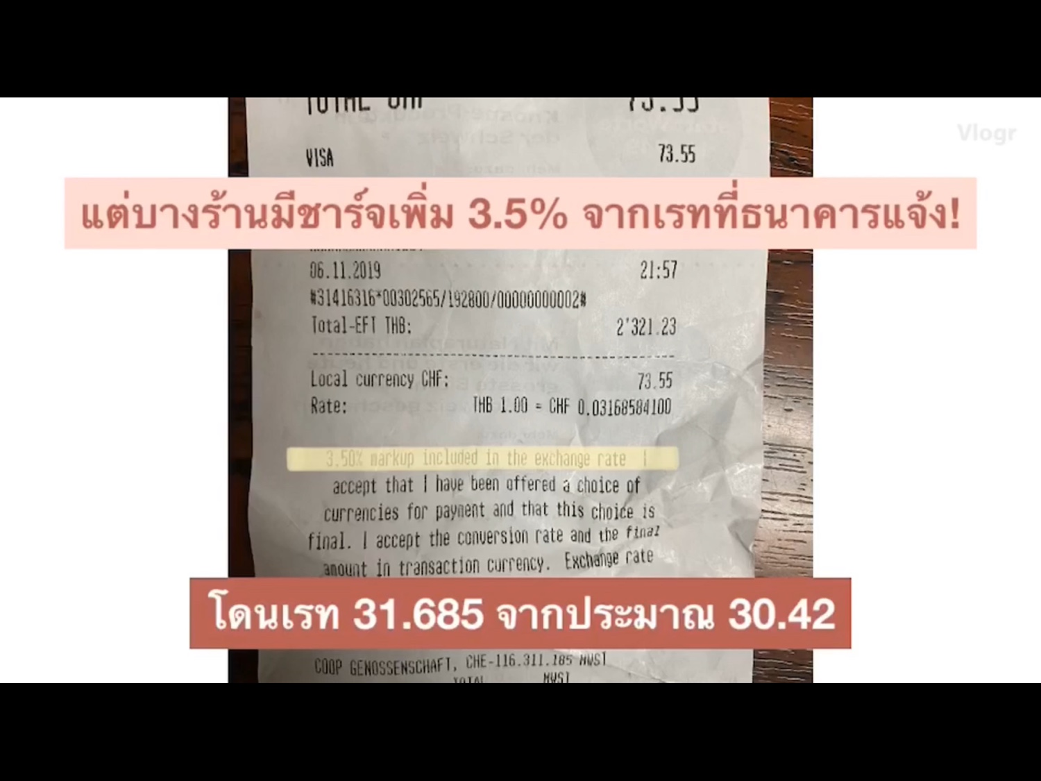ชาร์จเพิ่ม 3.5% จากเรทที่ธนาคารแจ้งไว้ 😂😂 เป็นบิลที่ซื้อของจาก Coop Supermarket ที่เมืองลูเซิร์น ประเทศสวิตเซอร์แลนด์ คิดว่าน่าจะเป็นร้านค้าชาร์จนะคะ เราเลยไม่แน่ใจว่าที่รูดๆไป โดนชาร์จมากน้อยแค่ไหน เพราะไม่ได้เก็บใบเสร็จเอาไว้เท่าไหร่ แต่ที่ยังมีใบเสร็จอยู่ ส่วนมากจะไม่มีชาร์จเพิ่ม คือถ้าไม่มีเขียนว่าชาร์จเพิ่มในสลิปก็สบายใจได้ค่ะ ซื้อใน Duty free ที่ Munich ก็คิดเรทปกติ ไม่บวกเพิ่มค่ะ