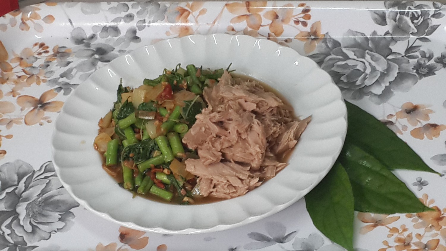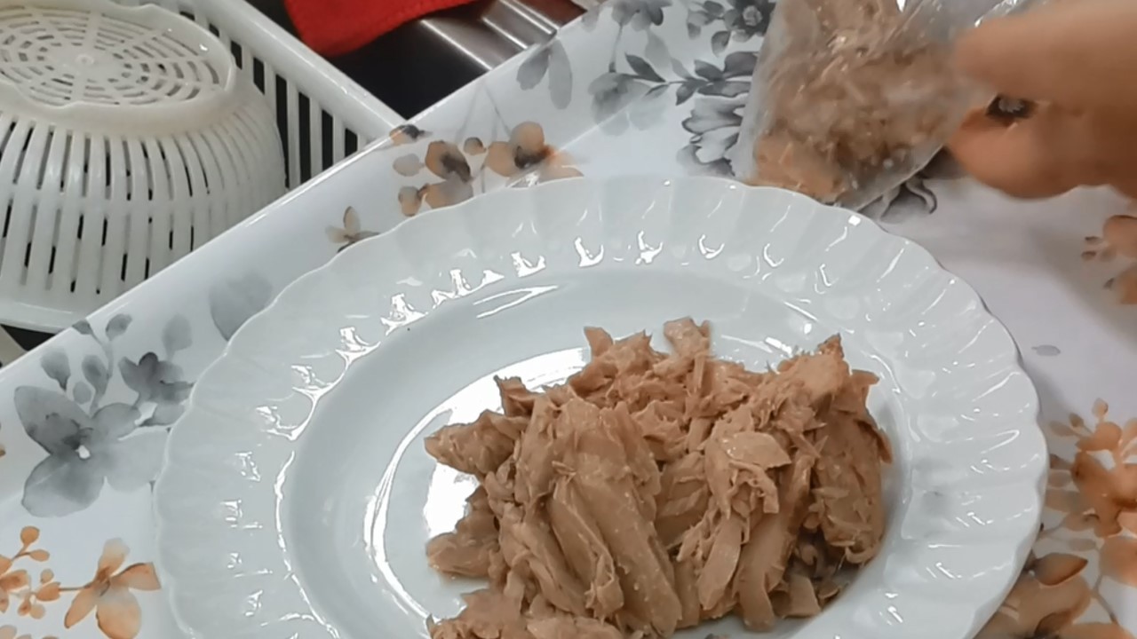 1. ทูน่า 150-200 กรัม/หอมใหญ่/ถั่วฝักยาว/ใบกระเพรา/น้ำปลา