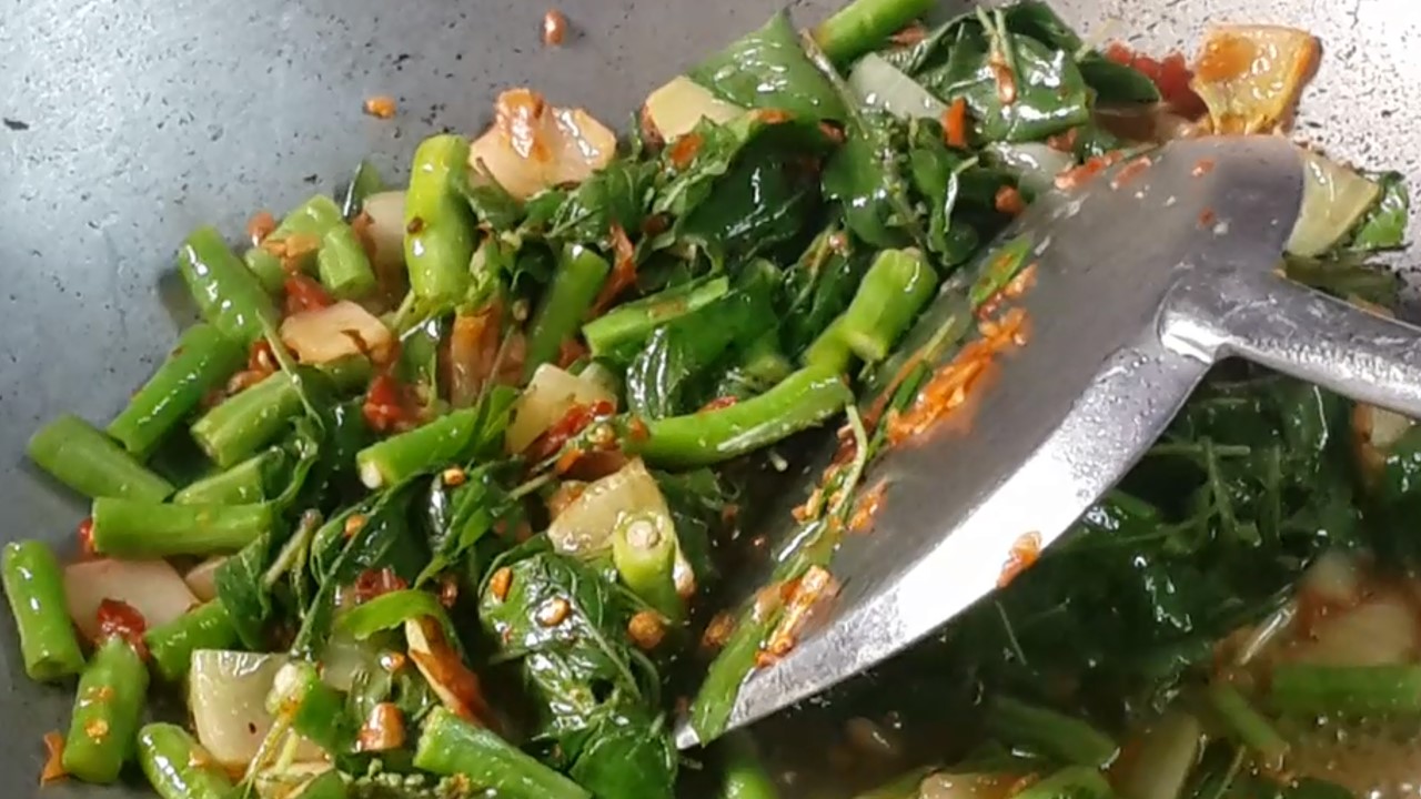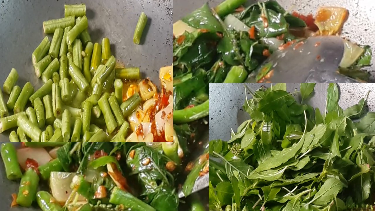 4. ตามด้วยถั่วฝักยาว/น้ำนิดหน่อย/ใบกระเพรา/น้ำปลา คนให้กระเพราสุก