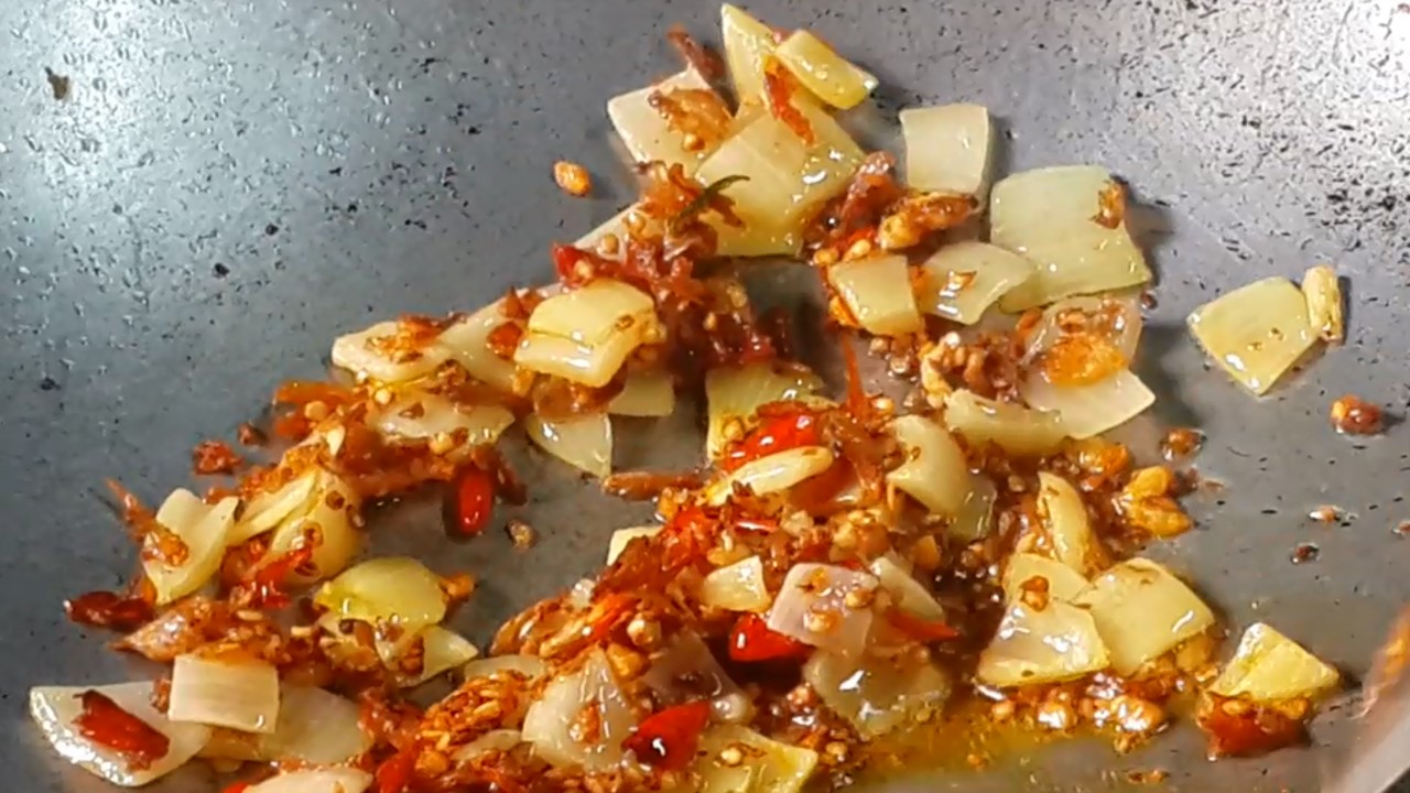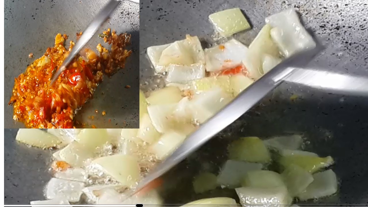 3. ใส่พริก+กระเทียมตำ ไปทอดให้หอม