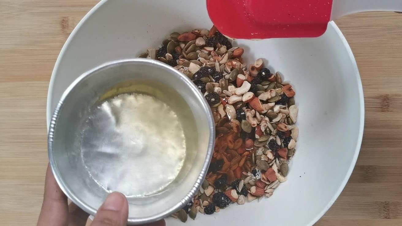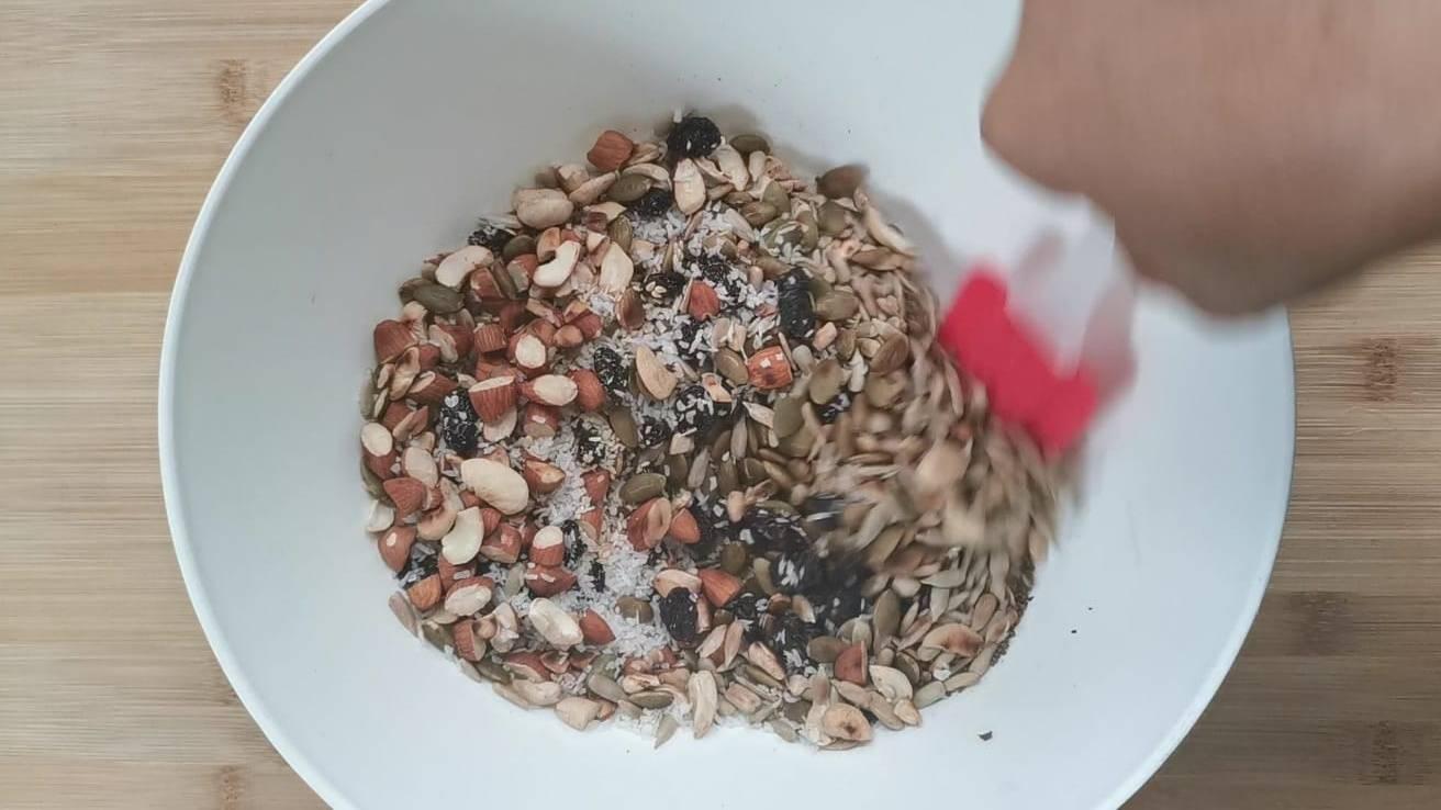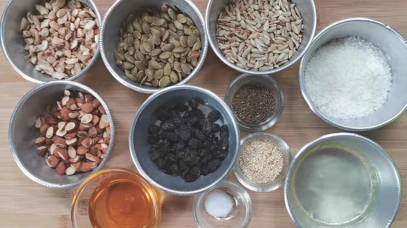 เรามาดูส่วนผสมกันเลยค่ะ ธัญพืชทุกอย่างคั่วสุกก่อนนะคะ ที่ไม่คั่วมีแค่มะพร้าวอบแห้งและลูกเกด