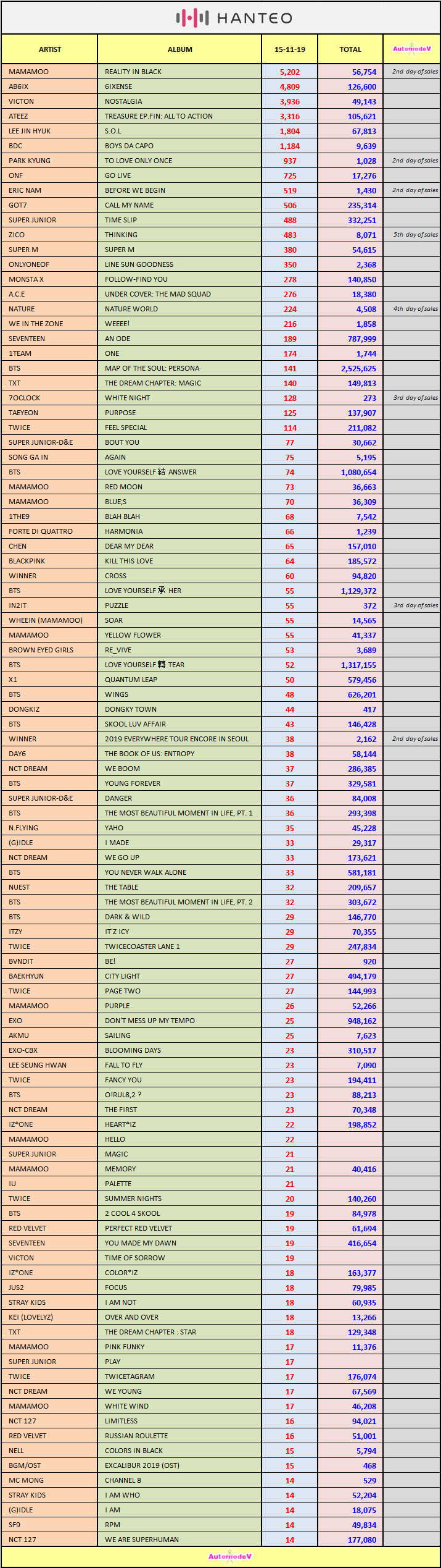 ยอดซื้ออัลบั้มจากชาร์ต HANTEO 20 พฤศจิกายน 2562 + MAMAMOO