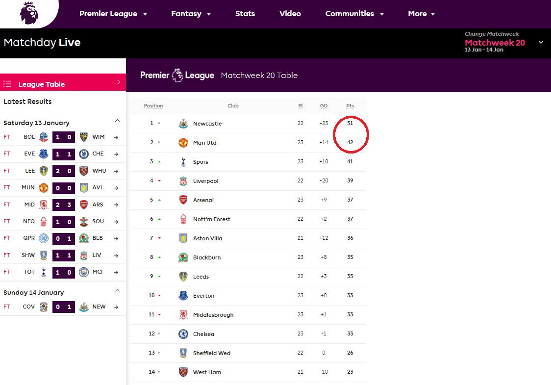 ปี1996 นิวคาสเซิ่ล นำ แมนฯยู ตามตารางข้างบน 9 แต้มในปีใหม่ สัปดาห์ที่ 2 แต่สุดท้าย ผี ปาดเอาแชมป์ไป ตัวอย่างมีให้เห็น ชัดเจนสุดๆ