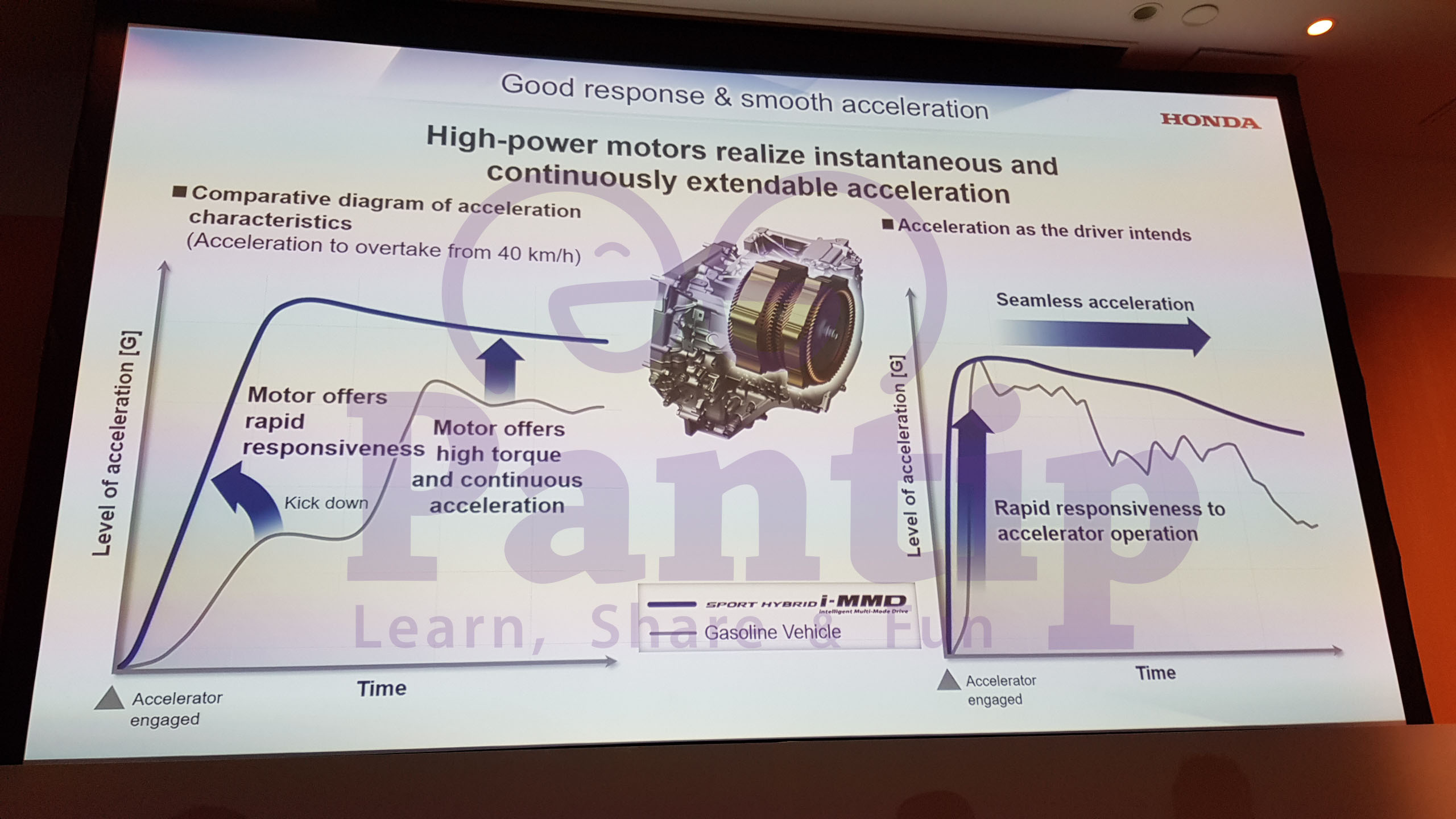 ภาพนี้เทียบระบบไฮบริดอื่นกับ i-MMD ซึ่งจะมีจุดเด่นคือ จะมีชุดคลัทช์ เข้ามาส่งกำลัง และตัดกำลัง จากเครื่องยนต์ไปที่ล้อหมุน