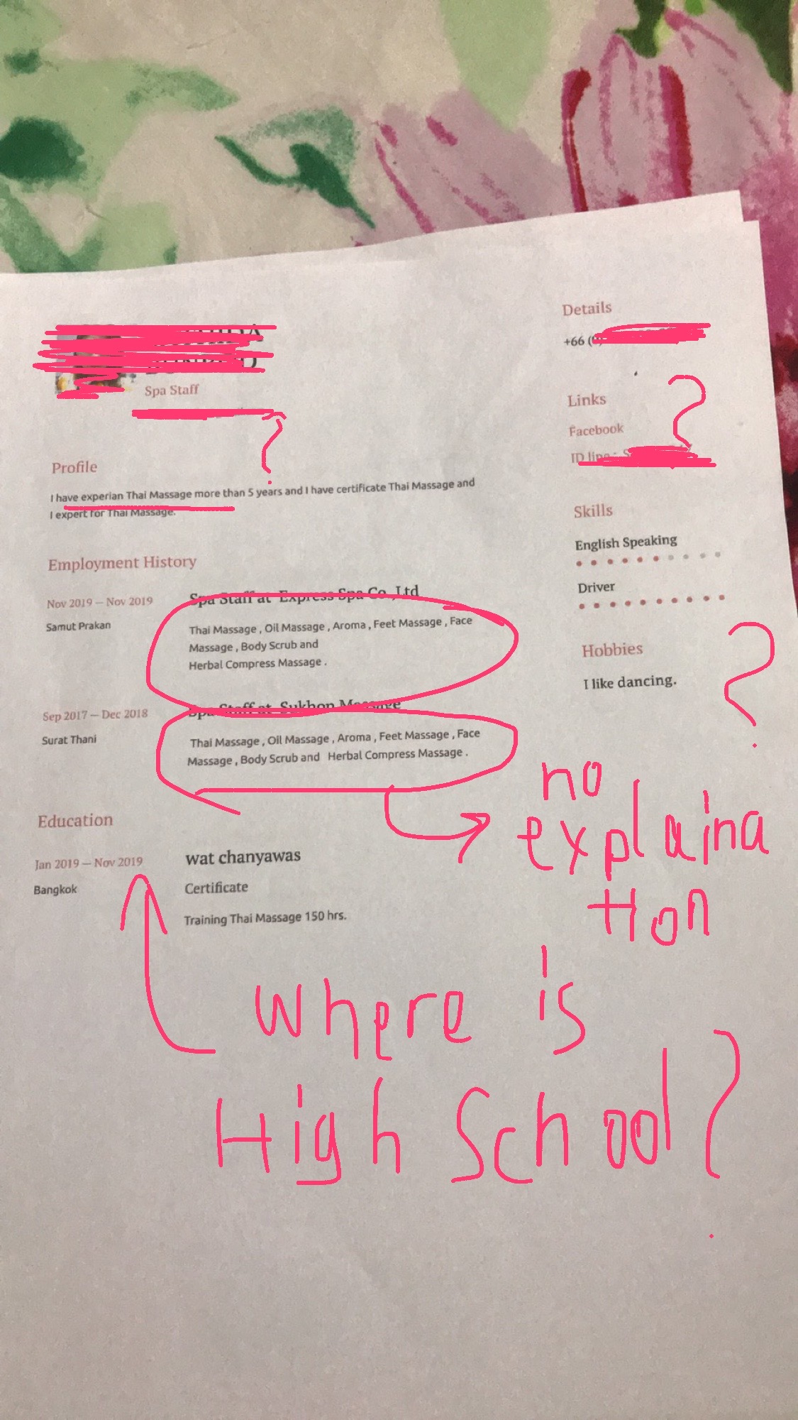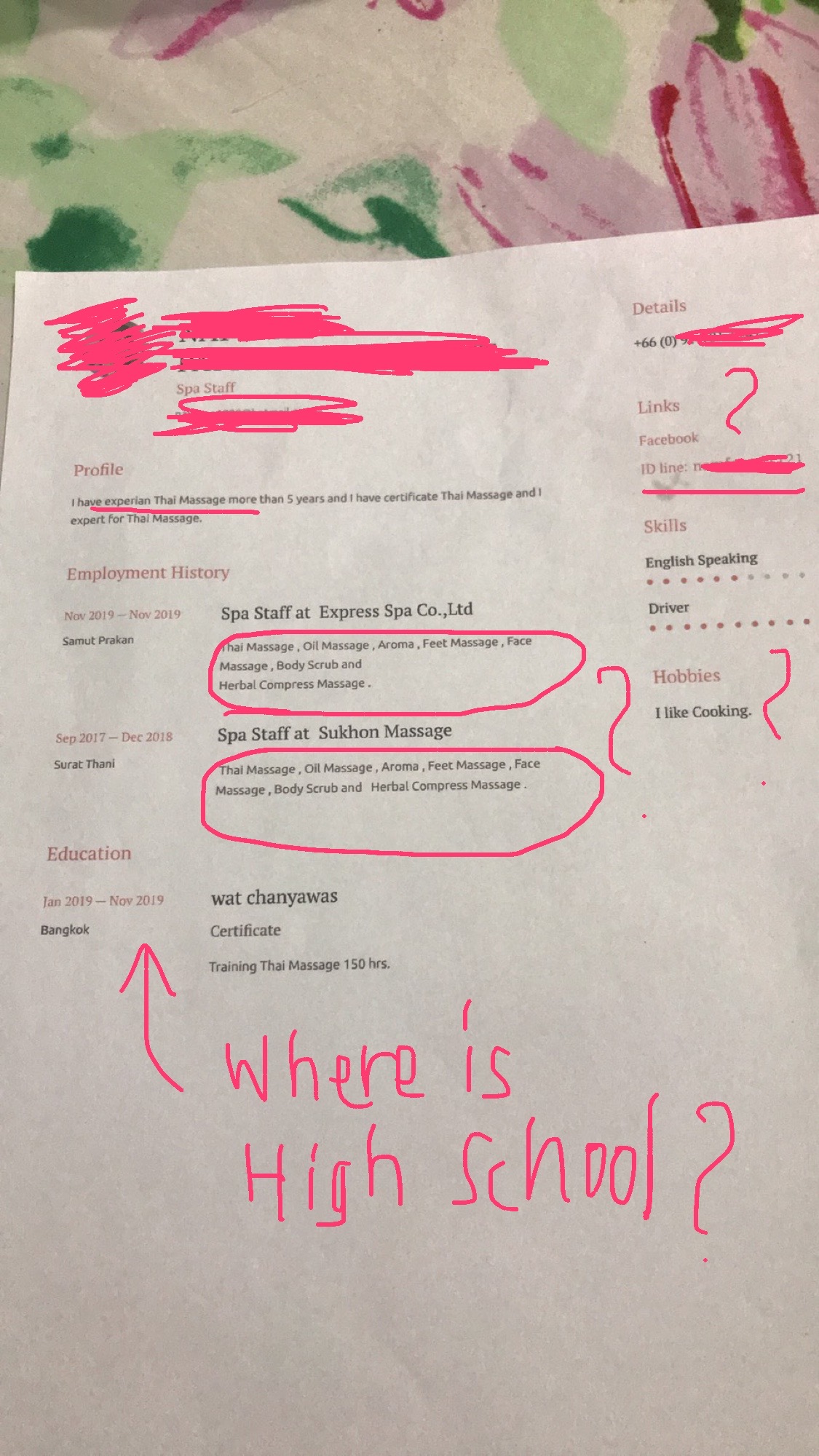 เพราะทางครอบครัวของป้าไม่รู้ภาษาอังกฤษเป็นอย่างดี จึงได้ทำการจ้างคนทำ Resume ที่สำนักงานนึงในตึก Trendy ตรงซอยสุขุมวิท 13