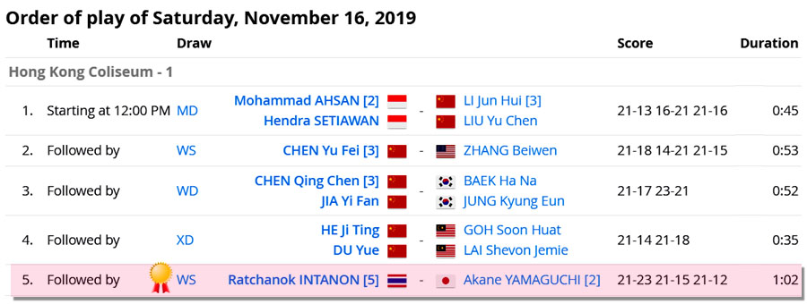 คลิปแบดมินตัน YONEX-SUNRISE Hong Kong Open 2019 : รอบรองชนะเลิศ (16 พ.ย. 62)