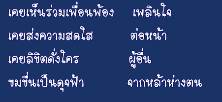 “ฉันเขียนบทกวีได้อย่างไร” ขณะนั้นฉันไม่เห็นเป็นกระดาษ ที่สามารถเขียนอะไรลงไปได้ ฉันมิเคยมีรั้วล้อมหัวใจ จึงปล่อยให้โบยบินจินตนา ขณะนั้นฉันมองเห็นเป็นทุ่งกว้าง ไ