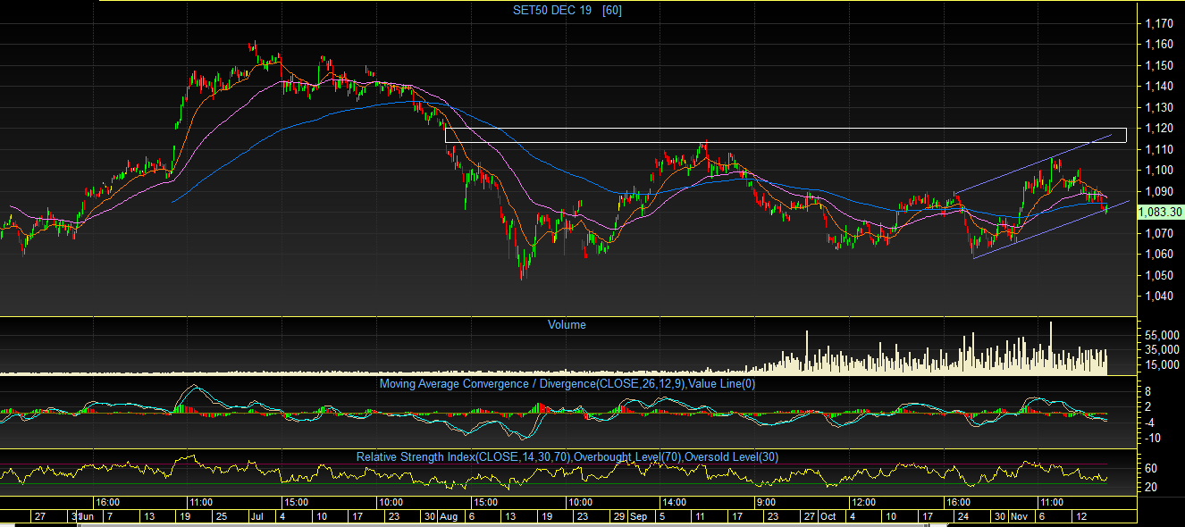 S50Z19 TF60 Min: หลังจากที่ดัชนีพุ่งทะยาน Rally ขึ้นมาอย่างต่อเนื่อง จนมาไกล้ถึงระดับ 1110 จุด ได้เกิดสัญญาณ Bearish Divergence