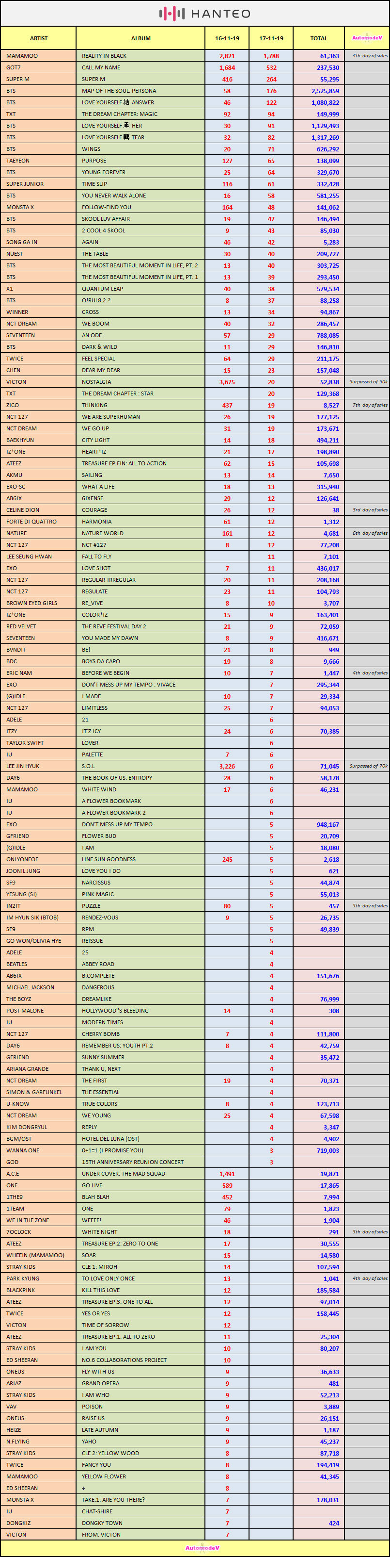 ยอดซื้ออัลบั้มจากชาร์ต HANTEO 2 - 3 พฤศจิกายน 2562 + MONSTA X & TAEYEON + SOLOISTS 1st WEEK + HIGHEST 1st WEEK
