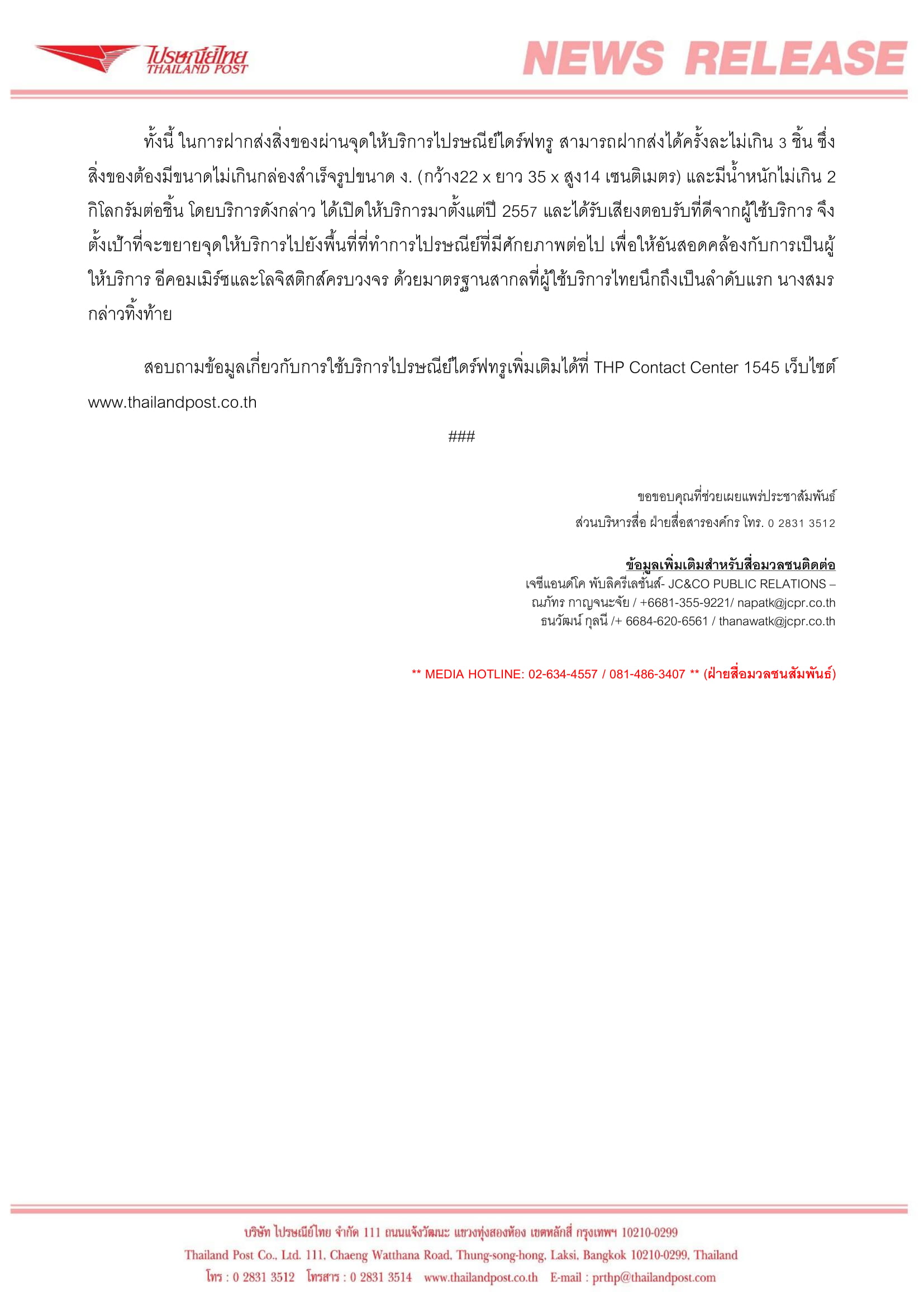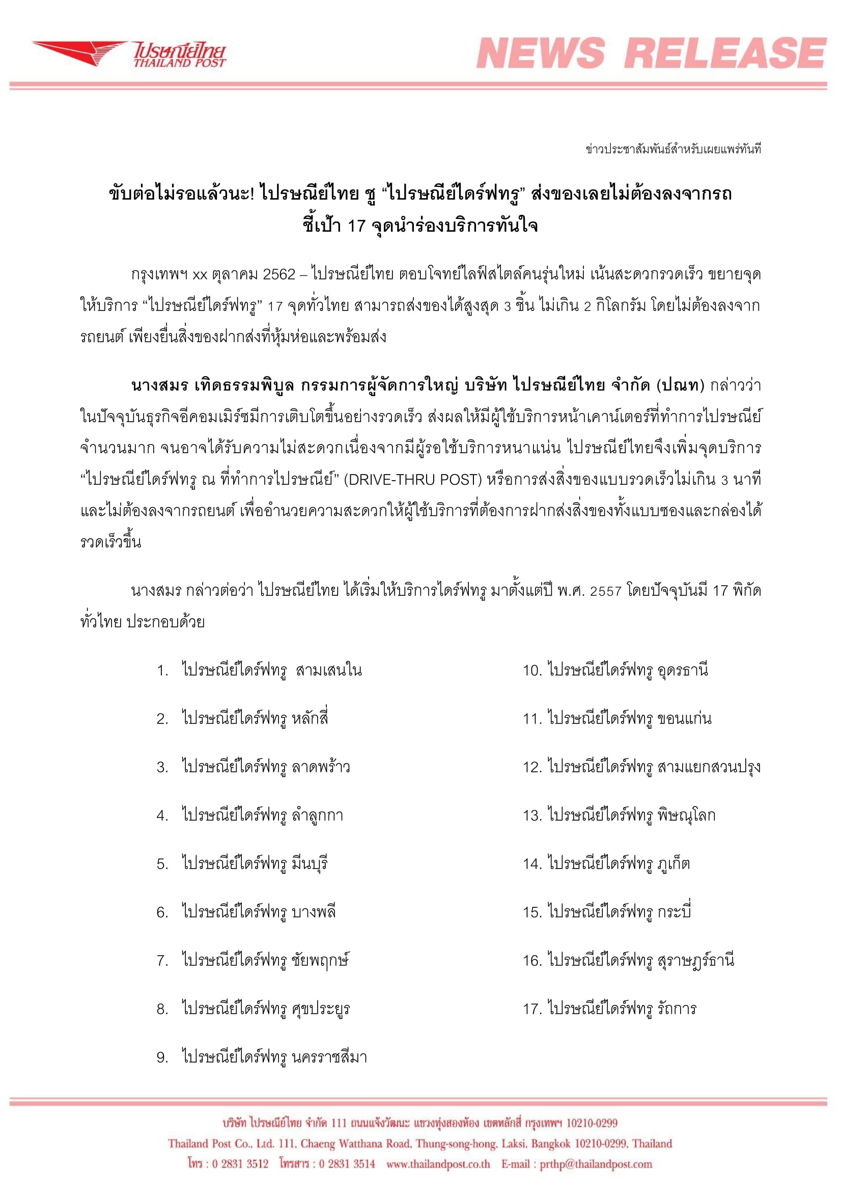 กรุงเทพฯ xx ตุลาคม 2562 – ไปรษณีย์ไทย ตอบโจทย์ไลฟ์สไตล์คนรุ่นใหม่ เน้นสะดวกรวดเร็ว ขยายจุดให้บริการ “ไปรษณีย์ไดร์ฟทรู” 17 จุดทั่วไทย สามารถส่งของได้สูงสุด 3 ชิ้น ไม่เกิน 2 กิโลกรัม โดยไม่ต้องลงจากรถยนต์ เพียงยื่นสิ่งของฝากส่งที่หุ้มห่อและพร้อมส่ง