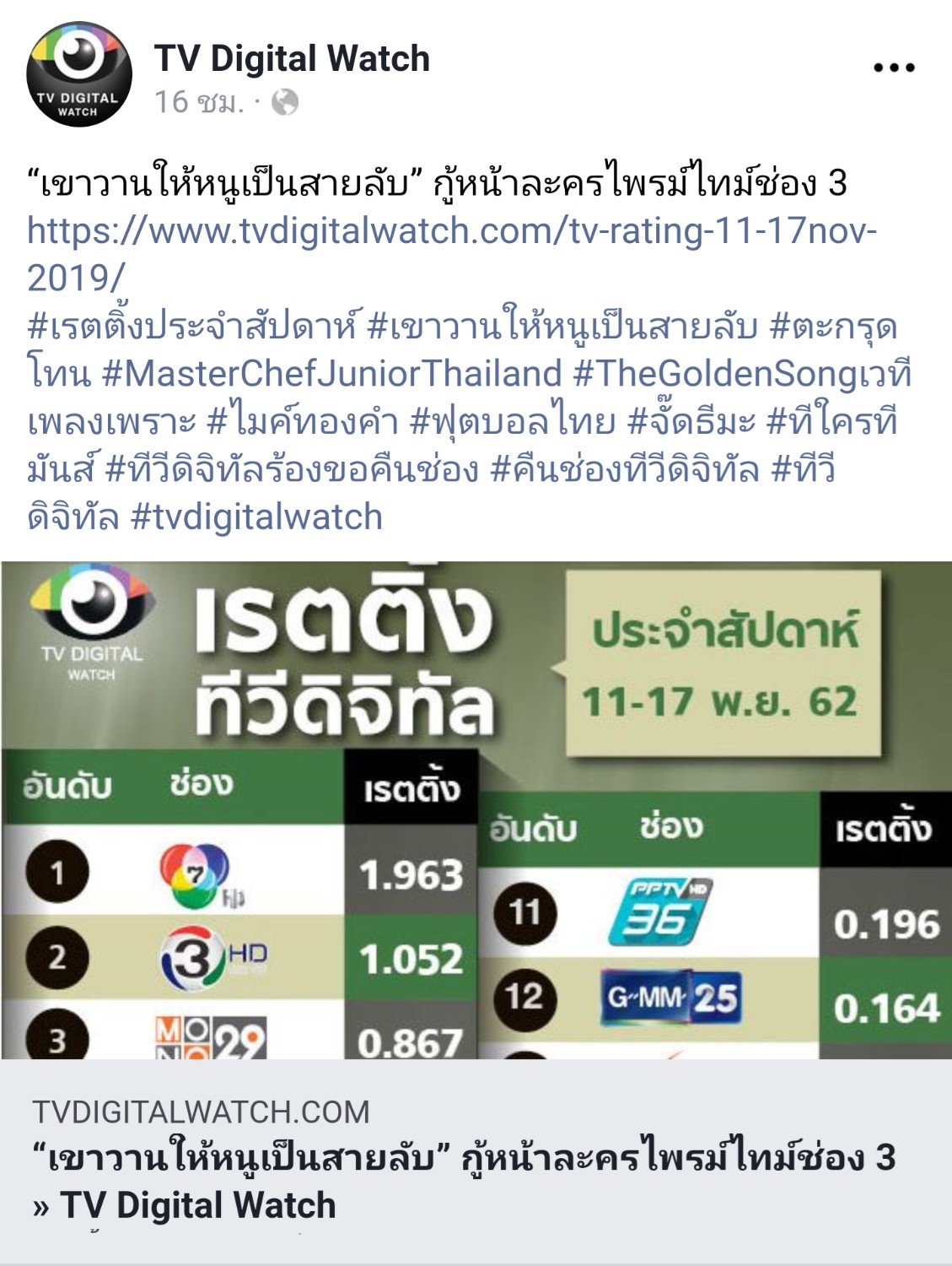 จากโพสของ TV DIGITAL WATCH ที่โพสรายงานเรตติ้งประจำสัปดาห์ที่ผ่านมา ผ่านทางเพจ facebook มีอยู่ แอคหนึ่ง ดูจะพยายามเหลือเกิน ถึงขั้นไล่ตอบเกือบจะทุกเม้นท์ พยายามจะทำให้ช่องมากสี(เม้นท์ส่วนใหญ่)+ช่องอื่นๆ ดูแย่ในสายตาคนอื่นๆ ติ่งช่องนั้นเขาเป็นกันแบบนี้หรอ จากโพสอื่นๆก็มีอืกเยอะเลย