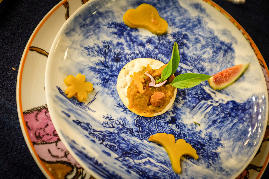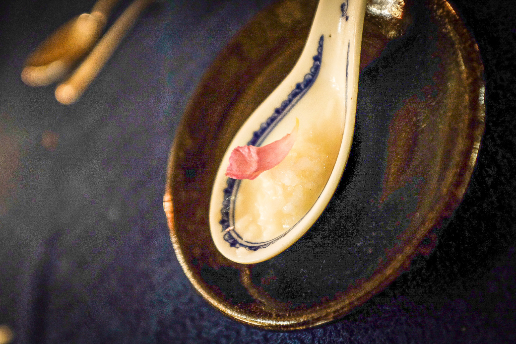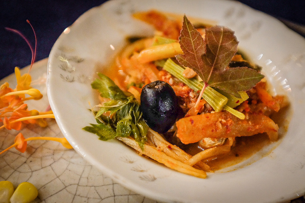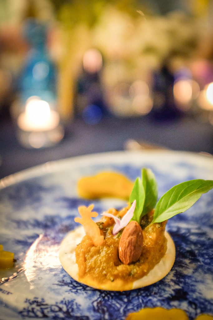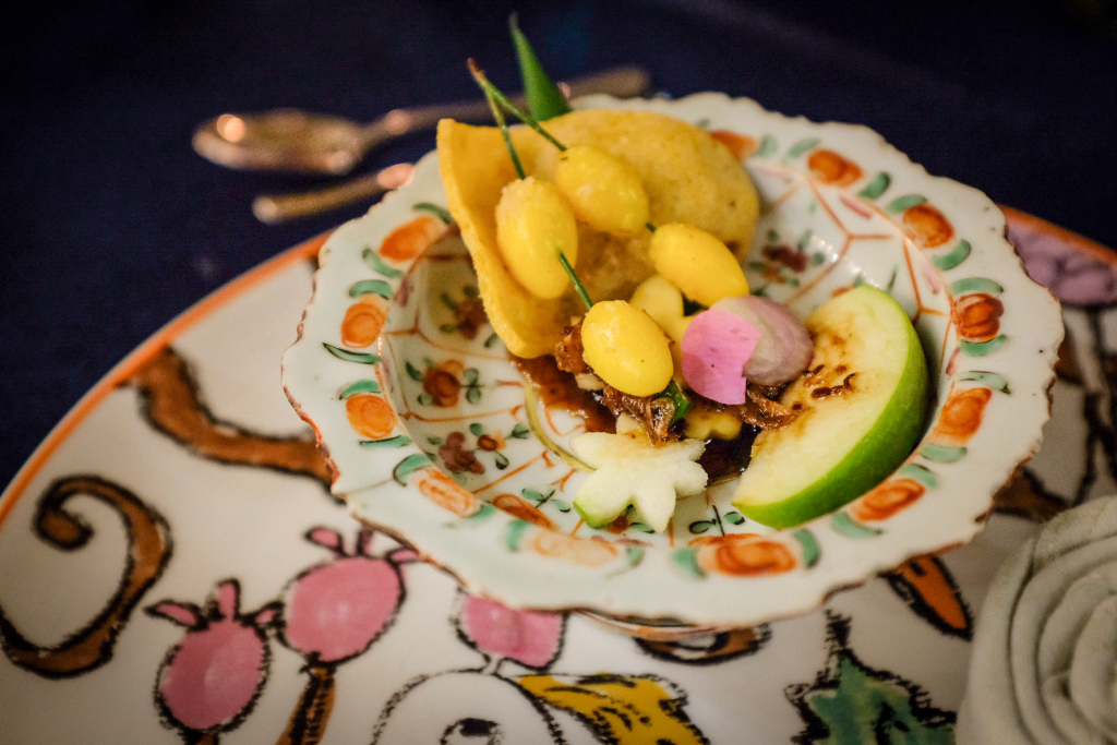 ต่อมาด้วยอาหารเรียกน้ำย่อยอย่าง มะม่วงน้ำปลาหวาน ที่กะปิมาจากจังหวัดตรัง บ้านเกิดเชฟกุ่ย มะม่วงแก้วถูกเสิร์ฟในพิมพ์รูปดอกไม้แสดงถึงความประณีต จานนี้มาพร้อมกับแปะก๋วยคั่วเกลือ ข้าวเกรียบ และแอปเปิ้ลเขียว