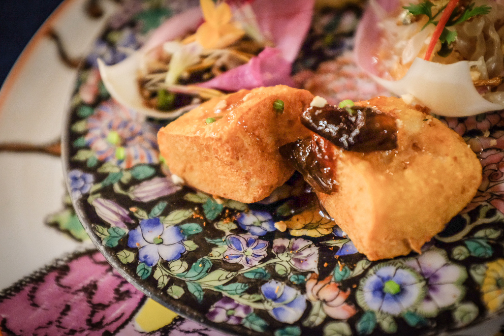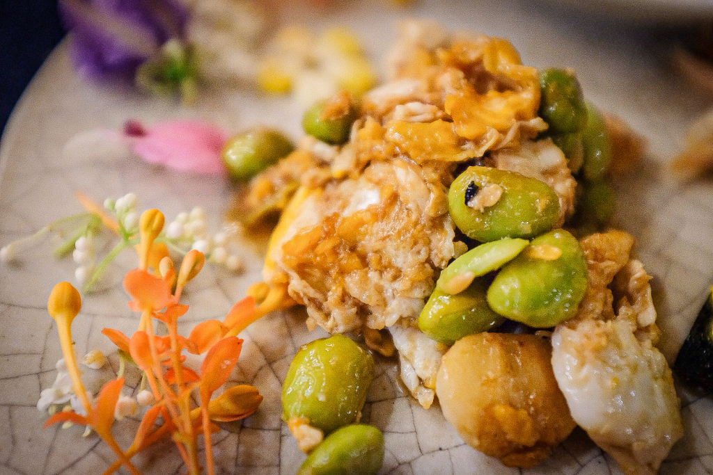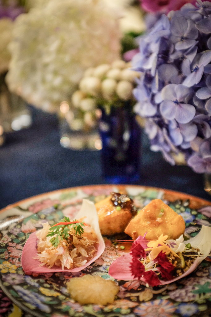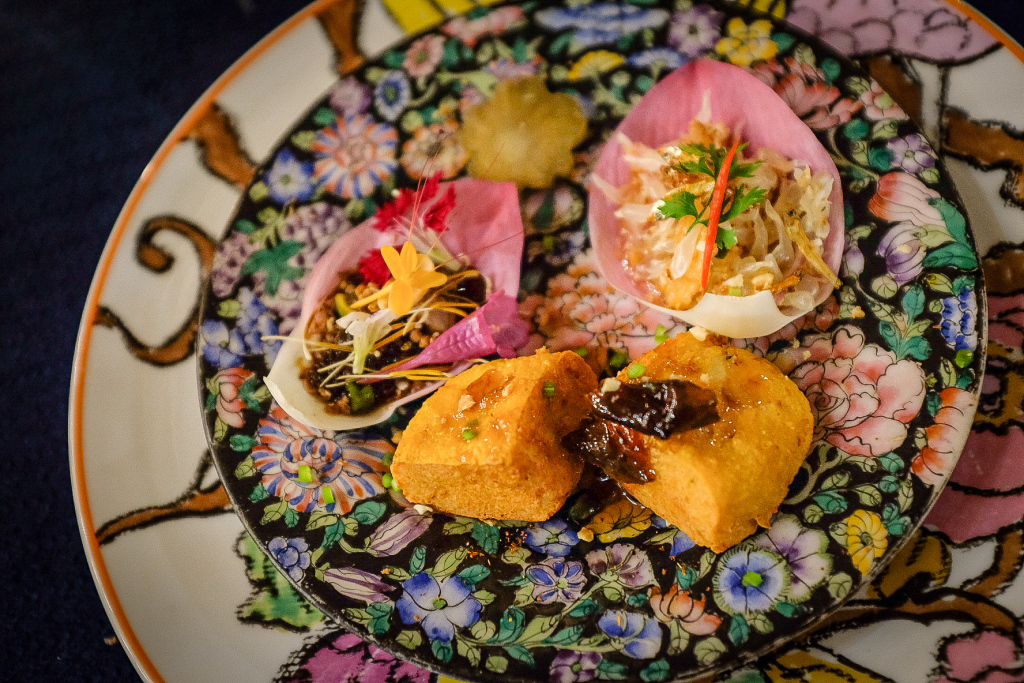 ถัดมาเป็นจาน 3 คำ เมี่ยงมะพร้าวทับสะแกคั่วราดด้วยน้ำเมี่ยงท๊อปด้วยดอกไม้ทานได้บนกลีบบัวหลวง ยำส้มโอขาวพิจิตรกุ้งแห้งสดปลาซิวบนกลีบบัวหลวง และเต้ากั๊ว(เต้าหู้) ราดด้วยน้ำซอสถั่วเปรี้ยว