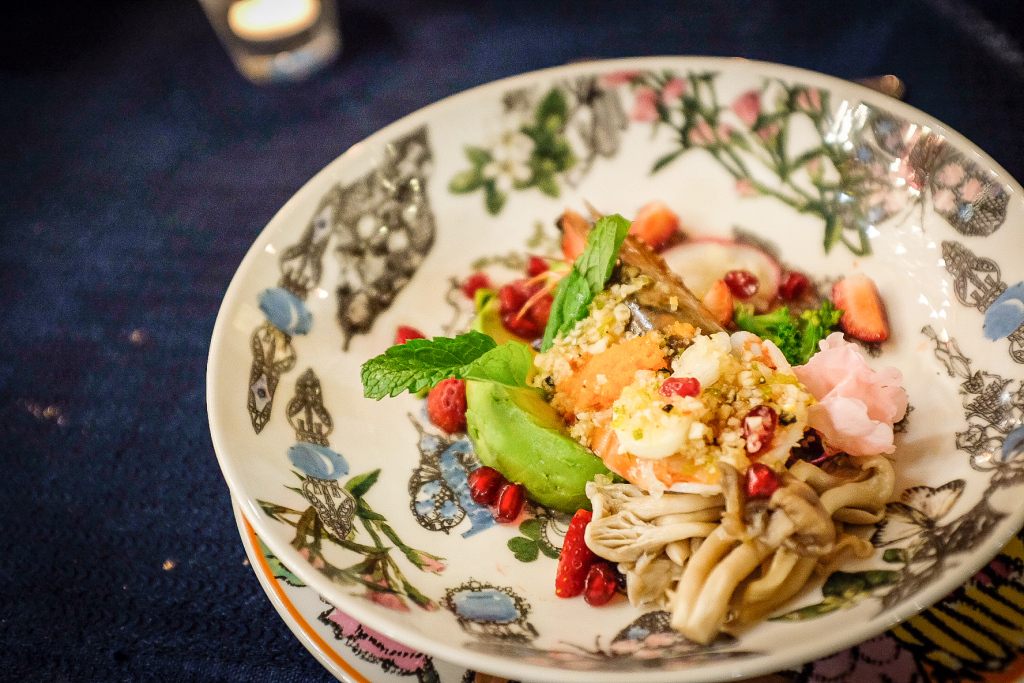 เซี่ยวเล่งนึ่ง – กุ้งแช่บ๊วยไร้สาร พร้อมกับน้ำยำรสเปรี้ยวกำลังดีปรุงรสจากกระเทียมโทน ส้มเล็ก มะนาว รองด้วยผักโครงการหลวงทั้งเห็ด อโวคาโด ดอกแคสีแดง บลอคโครี่ ดอกเทียนไทย โรยทับด้วยทับทิมอินเดีย และไข่กุ้ง