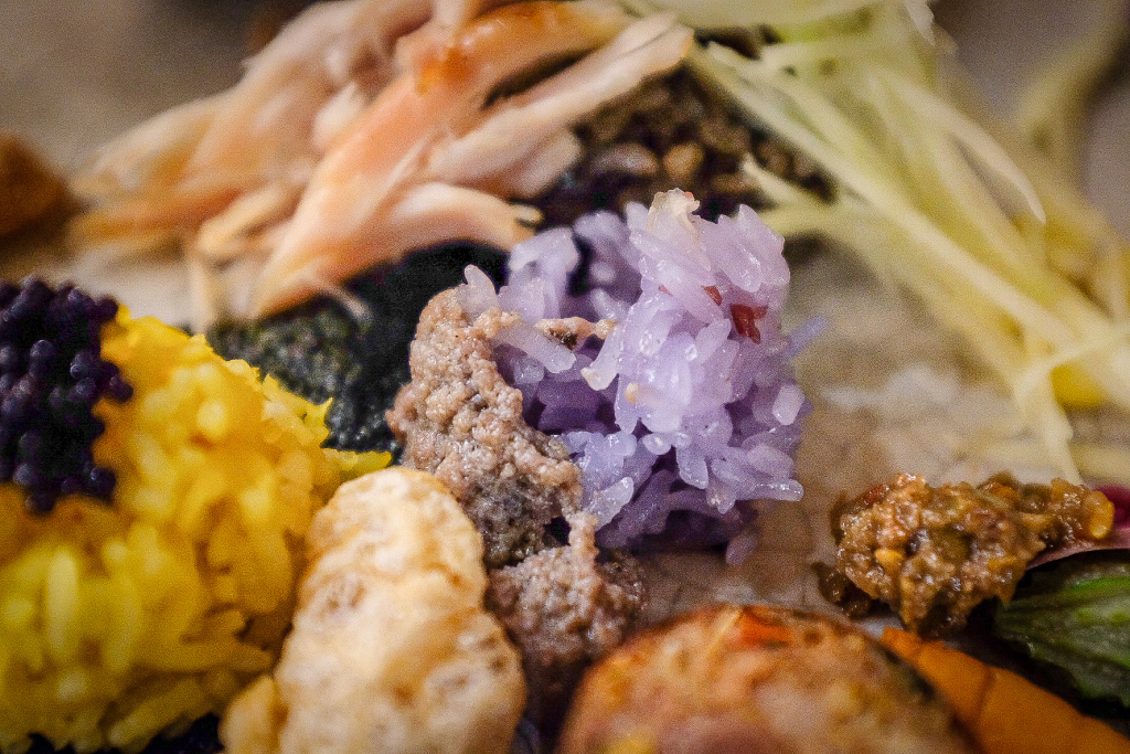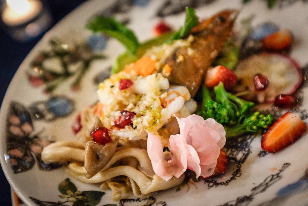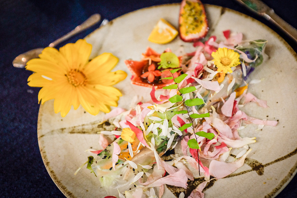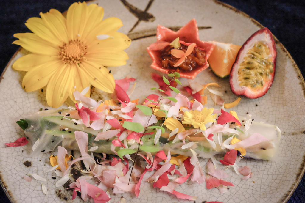 ทั้งจานยังโรยด้วยดอกไม้กินได้ทั้งดอกมะเขือ ดอกอโศก ดอกเทียน ดอกเอสเตอ