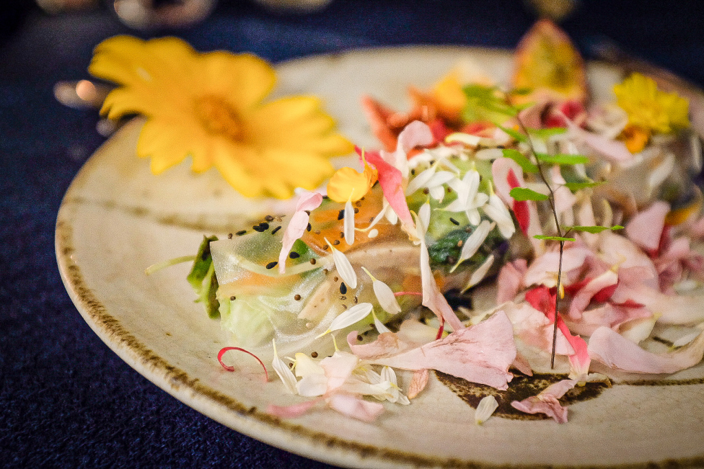 ตัวฟักทองปลูกเองภายในหุบเขาคนโฉด รสชาติแบบไทยๆขึ้นจมูกด้วยกลิ่นโหระพา ประดับประดาจานด้วยฟักทองกดลงพิมพ์รูป และตัวฟักทองจะทาด้วยเกลือดอกซากุระจากเกียวโต (ดอกซากุระชุดสุดท้ายหมักกับดอกเกลือเป็นการถนอมอาหารของญี่ปุ่น) อ่อ มีแถมลูกฟิคปลูกในเชียงใหม่เป็นกับแกล้มอีกชิ้นด้วยนะ