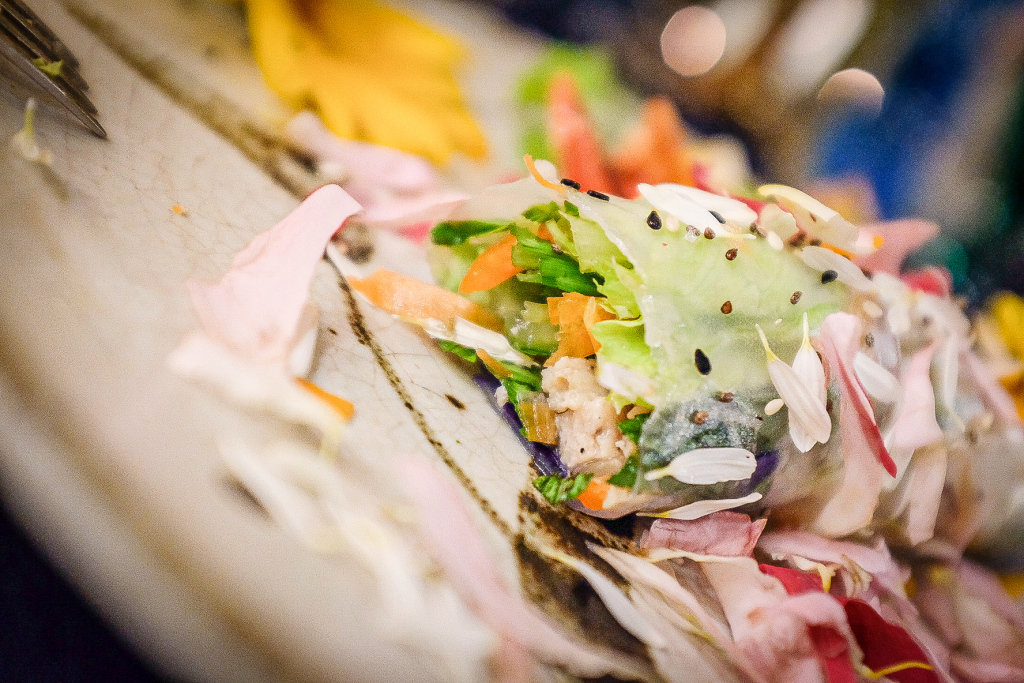โรลน้อยใจยานี้ประดับด้วยดอกเก็กฮวยขาวเหลือง ดอกกุหลาบมอญ(ปลูกเอง) ดอกบัวตองญี่ปุ่นที่มีกลิ่นหอมตรงกลางเกสรเหมือนน้ำผึ้ง ที่ช่วงนี้กำลังบานเต็มที่ และแน่นอนว่า กินได้เช่นกัน