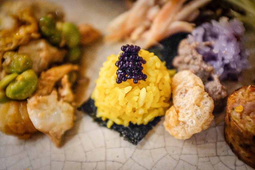 ออเดิร์ฟเมือง ได้แก่ น้ำพริกกระท้อนบนใบดองชงโค ข้าวหอมมะลิทุ่งกุลาร้องไห้ท๊อปด้วยไข่ปลาคาเวียร์ ข้าวเหนียวอัญชัญท๊อปด้วยอ่องปู มันปูปรุงรสแล้วนำกลับไปกระดองปูเอาไปย่างให้ได้กลิ่นหอม แคปหมูและไส้อั่ว