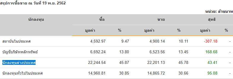 Sinthorn Summary 19/11/2562 : ต่างชาติซื้อสุทธิ 43.41 ลบ.