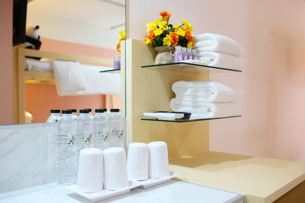 สำหรับในห้องพัก ท่านจะได้รับ น้ำดื่มและแก้วดื่มน้ำ ผ้าเช็ดตัว ตามจำนวนแขกที่สามารถเข้าพักได้ (โดยปกติอยู่ที่ ห้องละ 2 ชุด ยกเว้นห้อง แฟมิลี่ จะจัดให้ 4 ชุด) สำหรับสบู่และแชมพู จะบรรจุห้องละ 1 ชุด โดยวางไว้บนบาร์กระจก ท่านสามารถมาขอซื้อเพิ่มได้ที่เคาท์เตอร์ในภายหลัง)