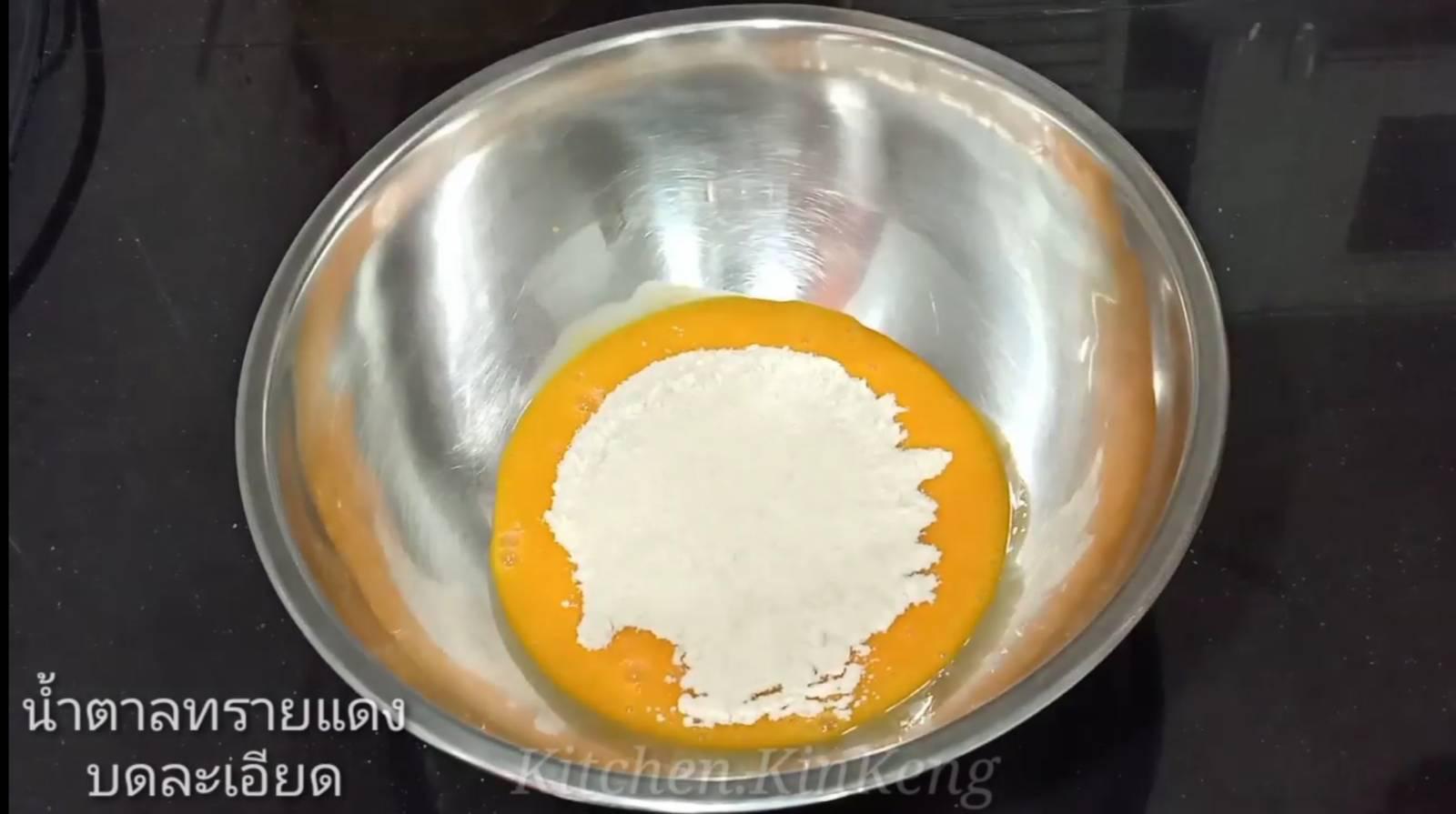 ตีผสมให้เข้ากันดี แล้วนำแป้งเค้ก100 กรัม ผงฟู 1 1/2ช้อนชาใส่ตะแกรงร่อน