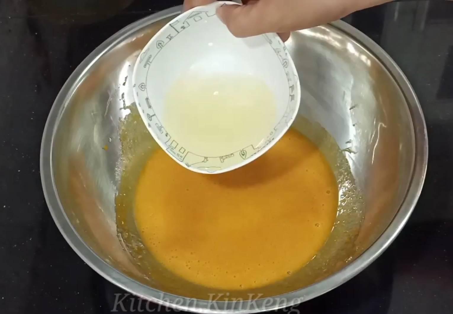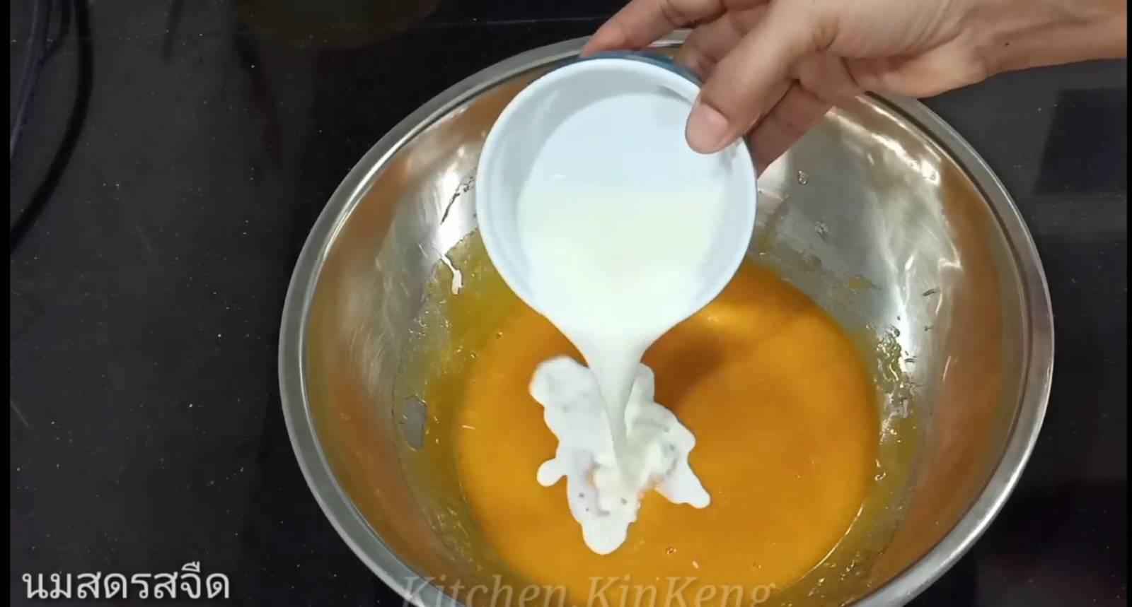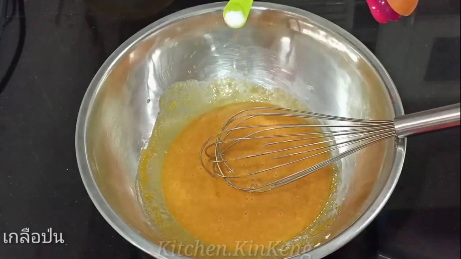 ตีผสมให้เข้ากัน ตามด้วยเกลือ 1/4 ช้อนชา