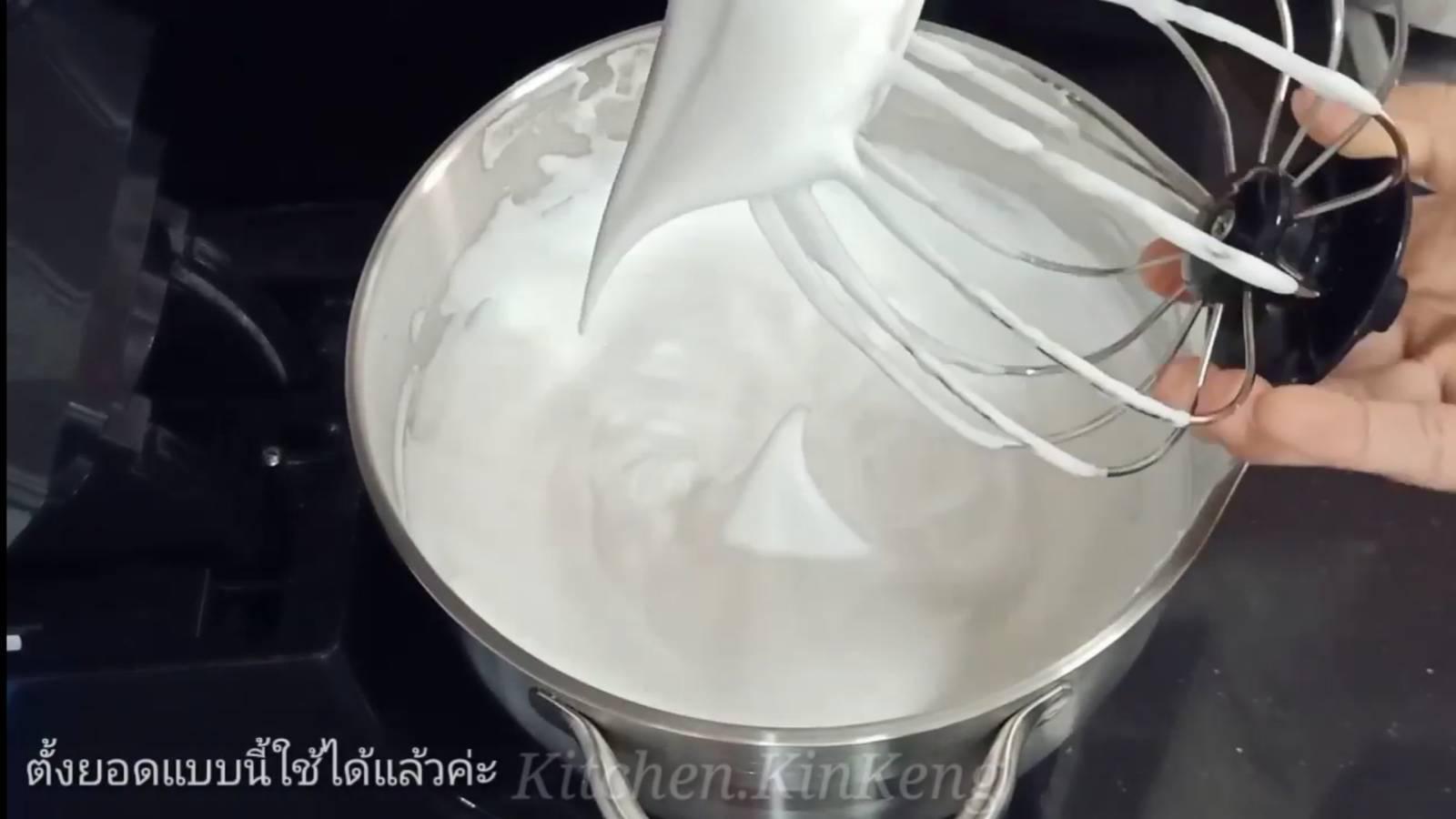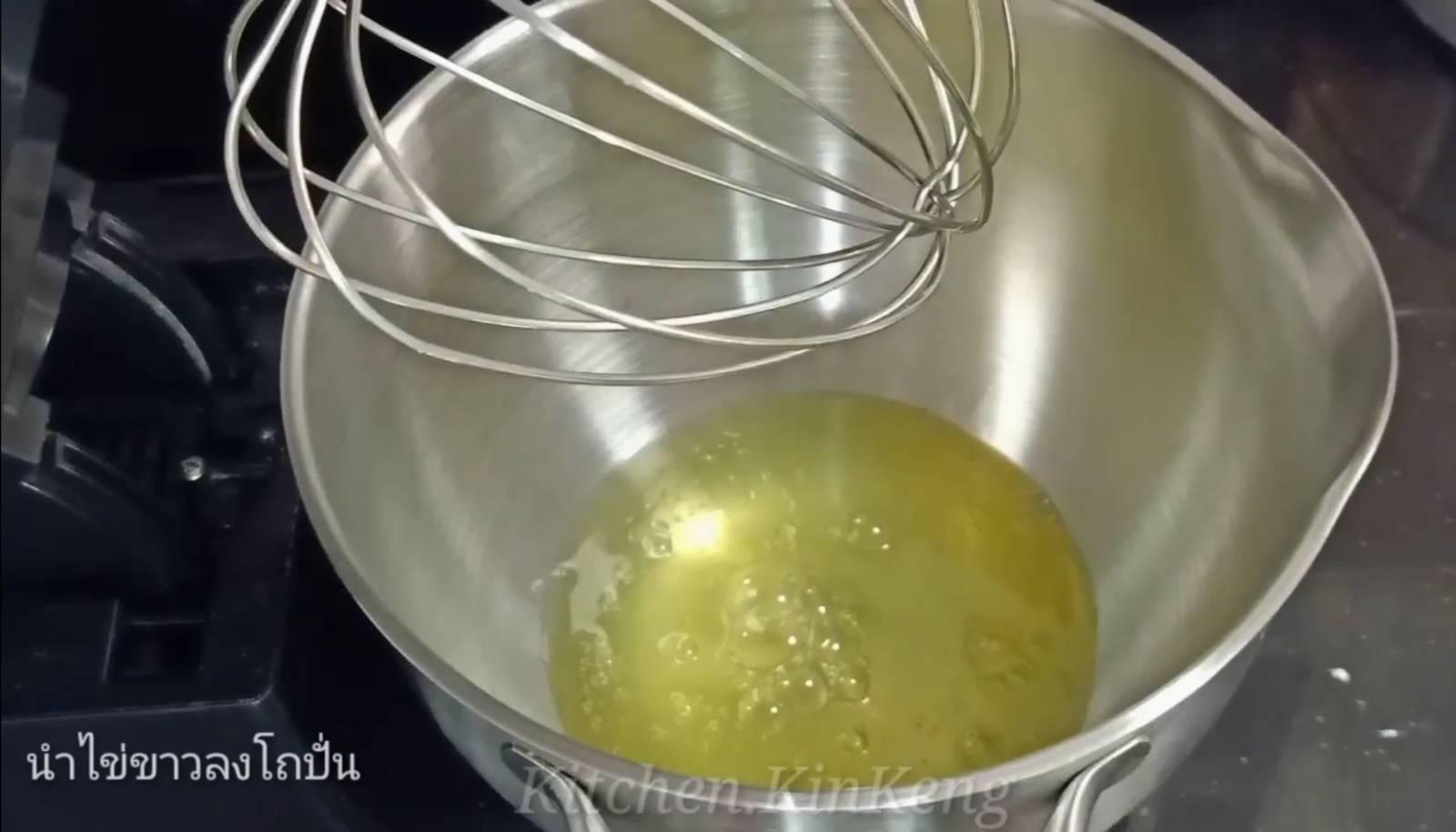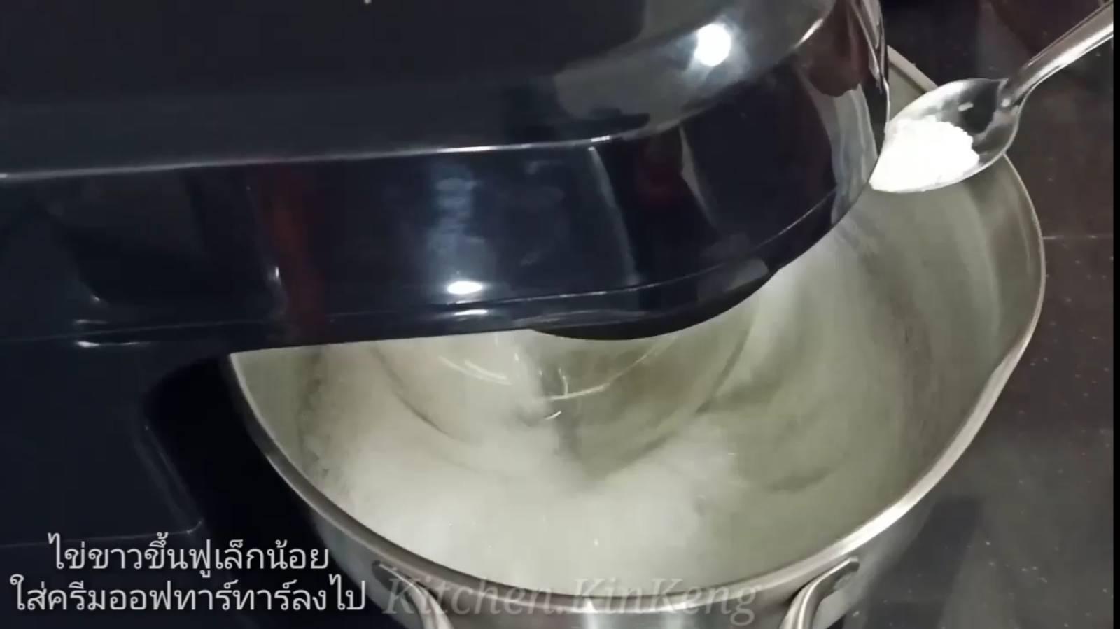ไข่ขาว 6 ฟองลงในโถปั่น ตีให้ขึ้นฟองเล็กน้อยแล้วใส่ครีมออฟทาร์ทาร์กับน้ำตาลลงไปตีให้ขึ้นฟูและเป็นมันเงา