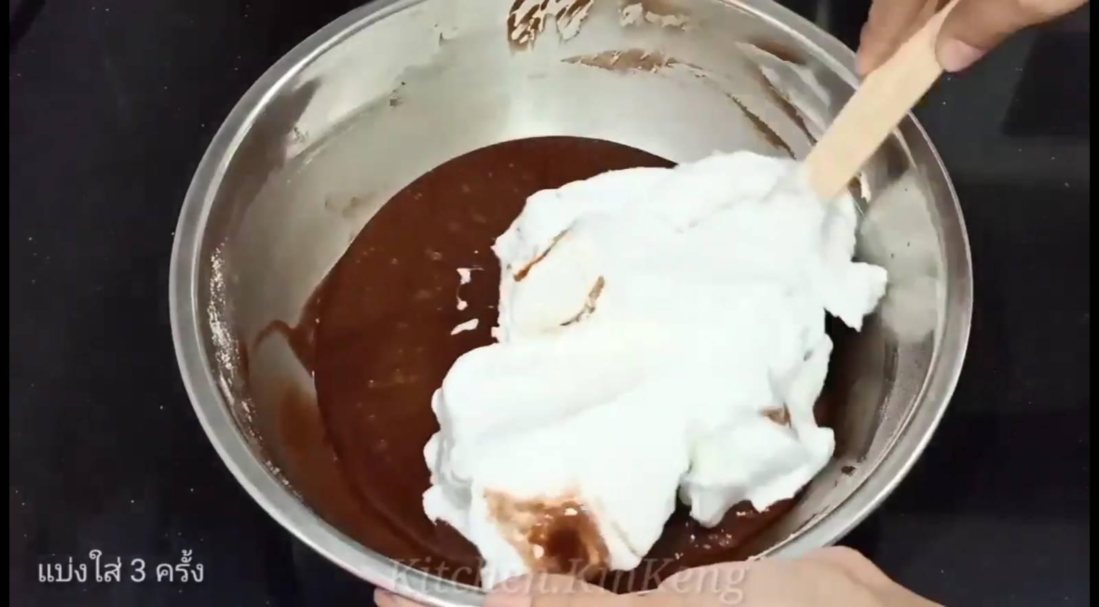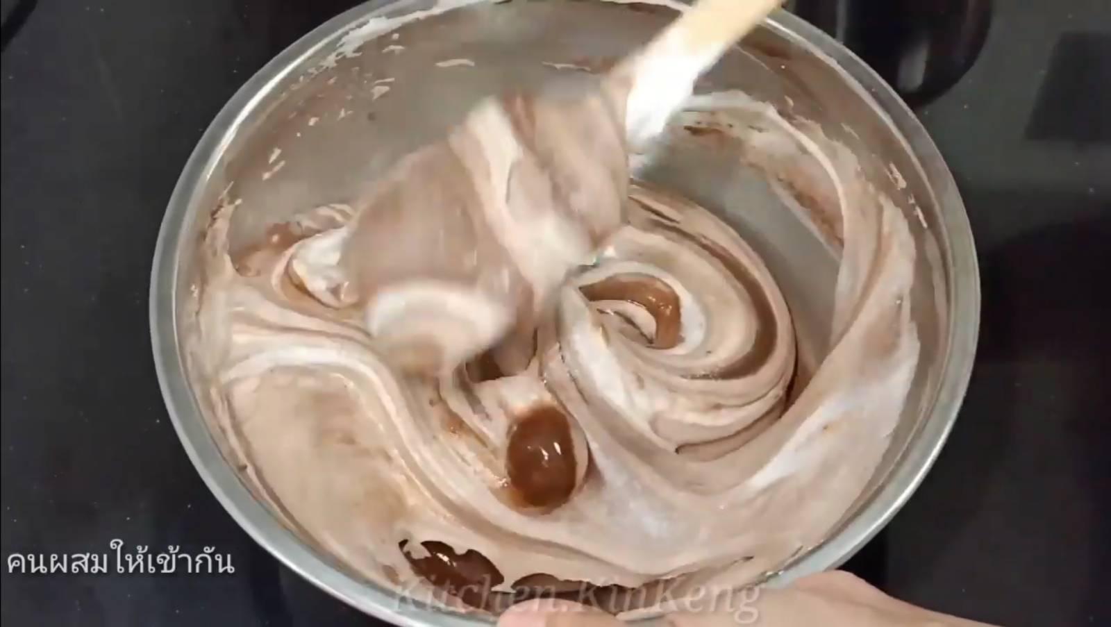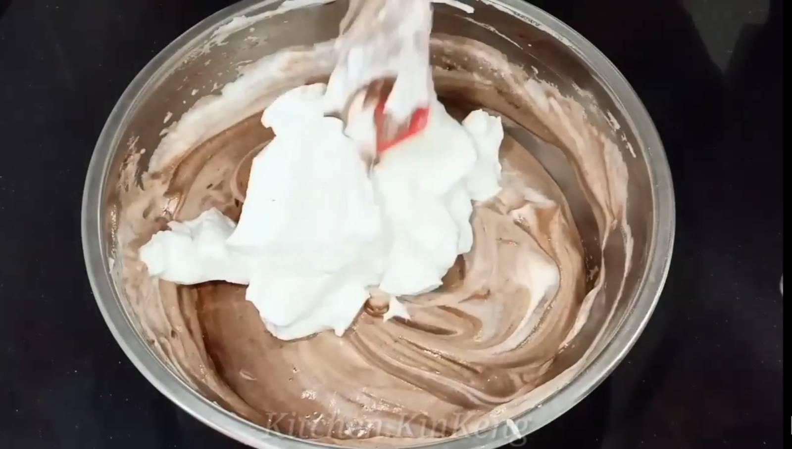 ไข่ขาวตีได้ที่แล้วนำมาผสมกับส่วนของไข่แดงแบ่งใส่ 2-3 ครั้งจะผสมง่ายค่ะ