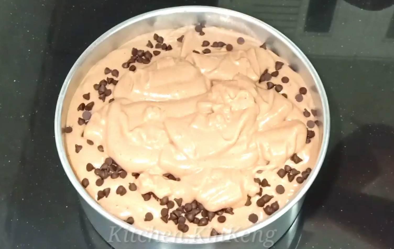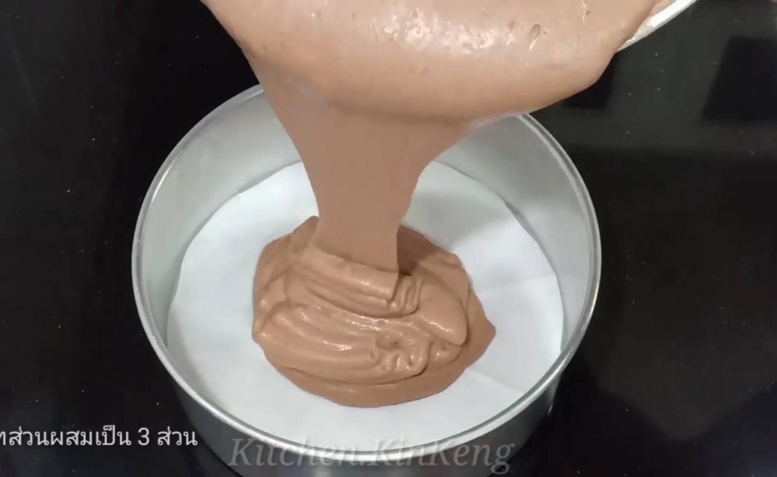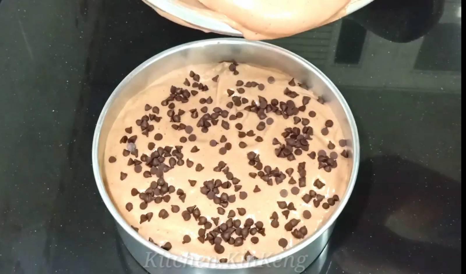 แบ่งเทเป็น 3 ชั้น แต่ละชั้นโรยด้วยช็อกโกแลตชิพตามความชอบค่ะ