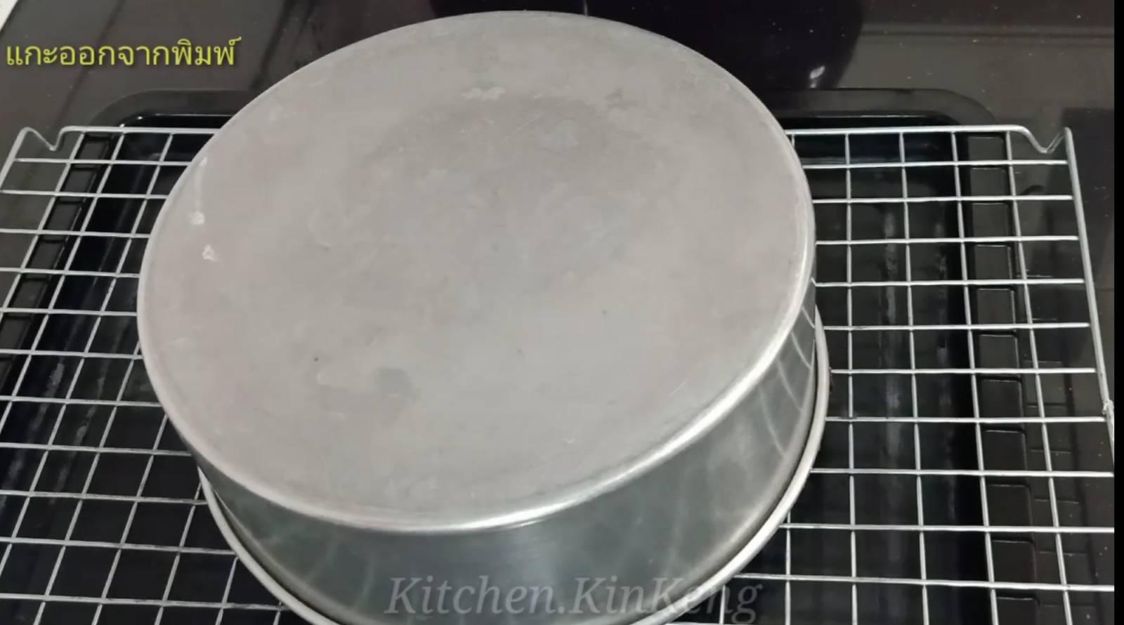 นำเค้กออกจากเตาอบคว่ำบนตะแกรงทิ้งไว้ให้เย็นสนิท
