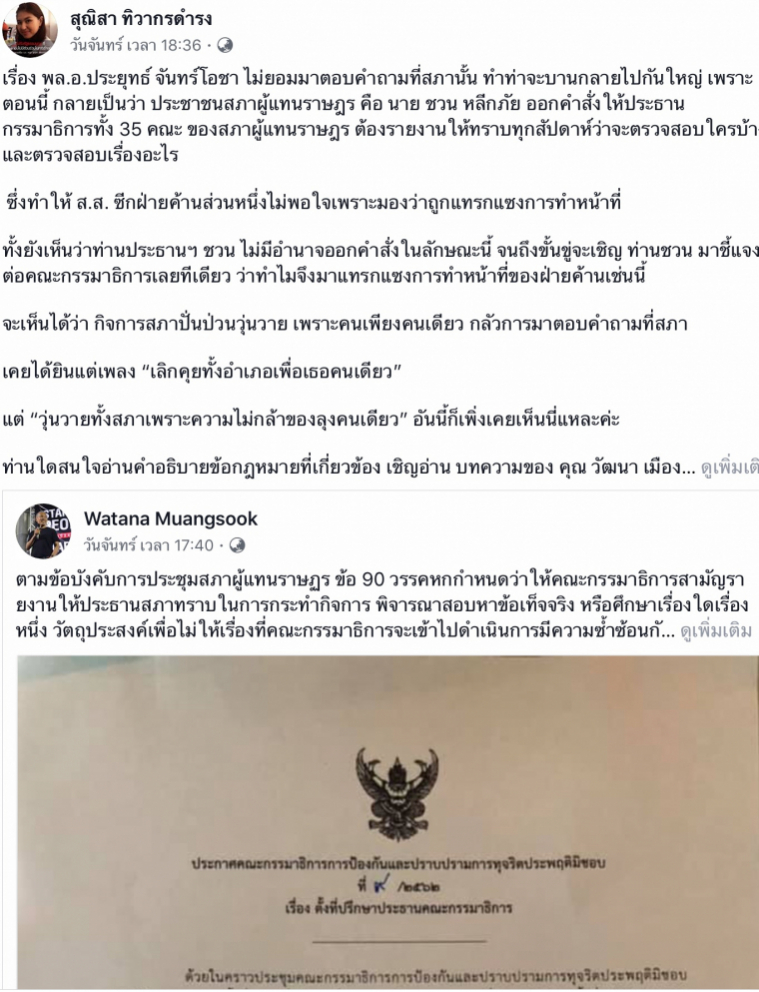 ร.ท.หญิงสุณิสาทิวากรดำรงสมาชิกพรรคเพื่อไทยโพสต์เฟซบุ๊กไว้เมื่อวันที่18 พ.ยที่ผ่านมาโดยระบุว่า "เรื่องพล.อ.ประยุทธ์จันทร์โอชาไม่ยอมมาตอบคำถามที่สภานั้นทำท่าจะบานกลายไปกันใหญ่เพราะตอนนี้กลายเป็นว่าประชาชนสภาผู้แทนราษฎรคือนายชวนหลีกภัยออกคำสั่งให้ประธานกรรมาธิการทั้ง35 คณะของสภาผู้แทนราษฎรต้องรายงานให้ทราบทุกสัปดาห์ว่าจะตรวจสอบใครบ้างและตรวจสอบเรื่องอะไร