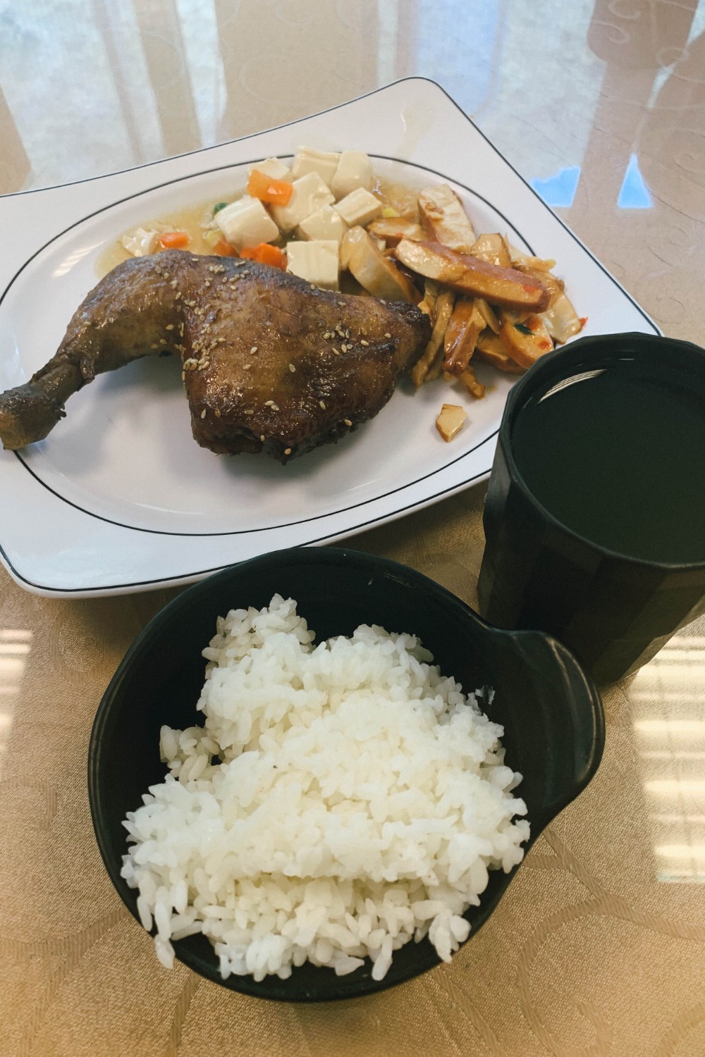 เราจะเลือกไก่หรือหมูได้แค่อย่างเดียวค่ะ เราเลือกปีกไก่มา รสชาติโอเคเลยนะ อาหารที่ไม่ใช่จานหลักก็มีให้เลือกตักเยอะเหมือนกันค่ะ ถ้าไม่ใช่อาหารหลักก็ตักได้เพิ่มเรื่อยๆค่ะ แต่ยังคงเหมือนเดิมคืออาหารติดมันมาก และเราลองตัวเต้าหู้ข้างบนคือรสชาติมันมากและจืดดด ไม่อร่อยสำหรับเรา เลยได้กินไก่กับเต้าหู้อีกแบบค่ะ น้ำมีให้เลือก 2 อย่าง เราเลือกน้ำส้ม มีผลไม้ด้วยนะ ค่อนข้างมีอาหารหลากหลายค่ะ