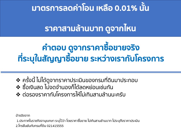 2.แล้วถ้าราคาประเมินของกรมที่ดินสูงกว่าล่ะ .... อ้างอิงจาก ประกาศในราชกิจจา และสอบถามจากกรมที่ดิน ได้รับแจ้งว่า ไม่ดูราคาประเมินของกรมที่ดินในคราวนี้ ดังนั้น แม้นว่า ราคาประเมินกรมที่ดินจะสูงกว่า แต่ถ้า ราคาซื้อขายจริง ไม่เกินสามล้าน ถือว่าเข้าเกณฑ์นี้