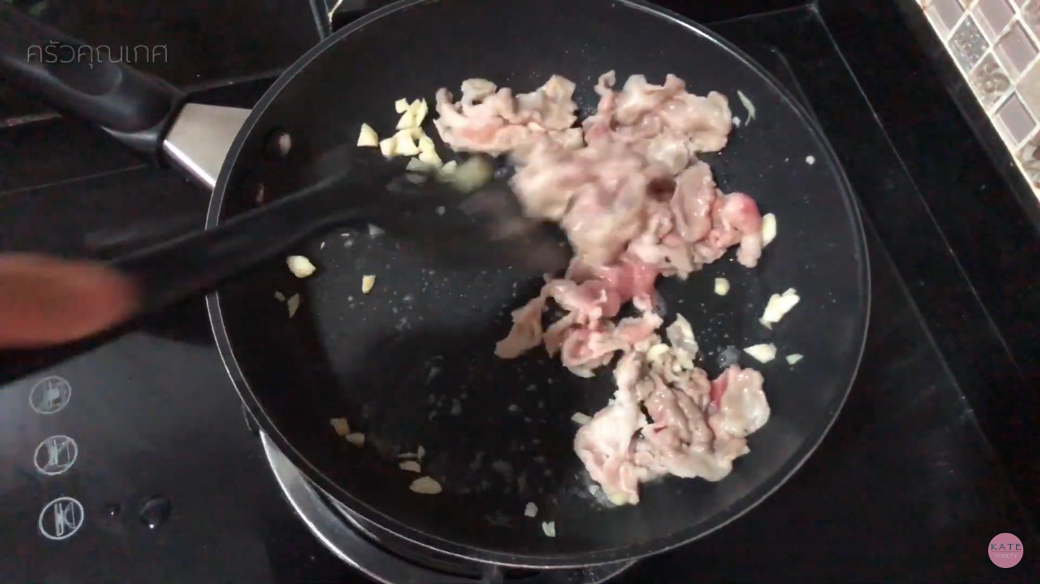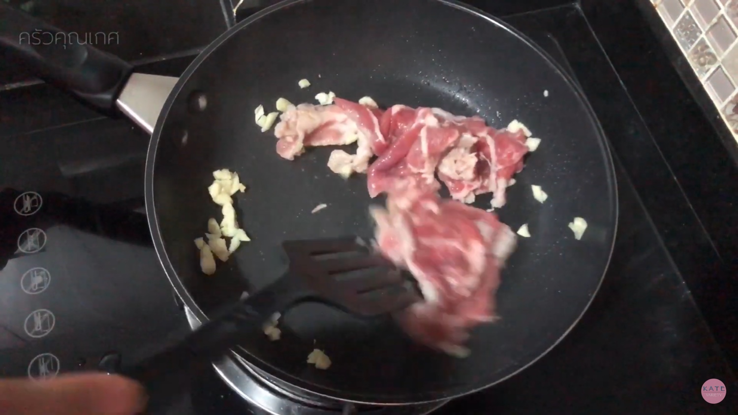2.ผัดจนกระเทียมเริ่มมีกลิ่นหอม แล้วใส่เนื้อหมูลงไปผัด