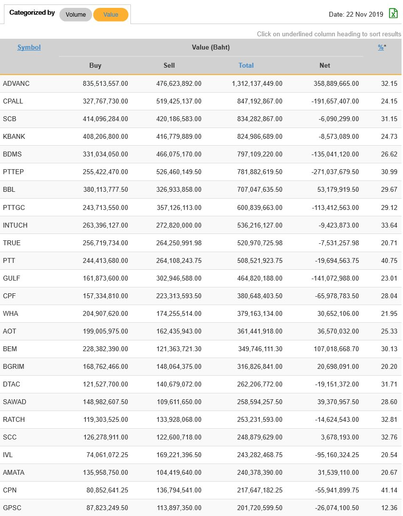 นักลงทุนต่างชาติ NVDR ซื้อ-ขาย มูลค่าสูงสุด 25 อันดับ 22/11/62
