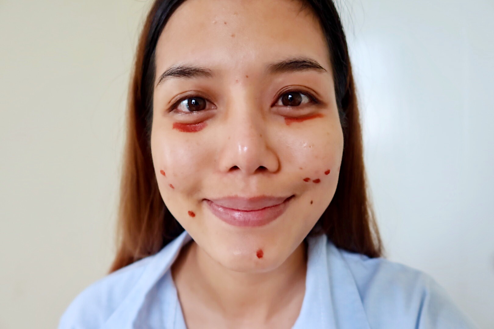 โซเอาลิปสติกมาแต้มๆบริเวณที่เป็นรอยชัดๆส่วนรอยเล็กรอยน้อยไม่ต้องก็ได้เพราะตัวแป้งเจ้านางค่อนข้างกลบมิดอยู่ เอาเฉพาะรอยใหญ่ที่มันชัดมากหรือบริเวณใต้ตาที่คล้ำมากก็ช่วยได้ แต่ระวังให้เบาๆมือหน่อยนะคะหากแต้มเยอะไปจะกลายเป็นหน้าแดงไปทั้งหน้านะฮ่าๆเจี๊ยกๆเลยนะอันนี้อย่าหาว่าไม่เตือนเพราะโซเคยแล้ว ต้องลบล้างหน้าแต่งใหม่เลยเด้อฮ่าๆ