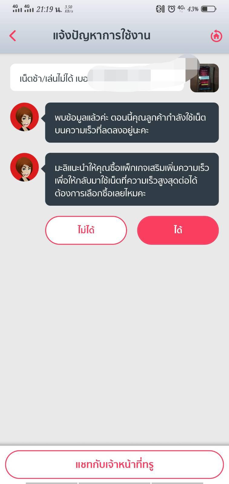 ช้ำร้ายเข้าไปอีก ติดต่อถามไปทาง App True iService. ได้ข้อความตอบกลับมาว่า "ลูกค้ากำลังใข้เน็ตในความเร็วที่ลดลง และแนะนำให้ซื้อเน็ตในความเร็วที่สูงขึ้น" ถามว่าคำถามจากระบบของTrue อย่างนี้คิดว่ามันใช่หรือ.. ( เน็ตความเร็ว 4 Mpbs แค่แชร์location ก็หมุนเป็นชม. น่าจะเรียกว่าเน็ตพิการแล้วรึเปล่า?