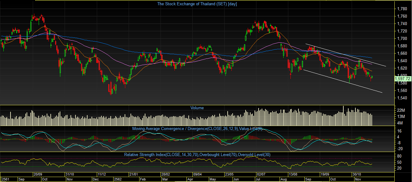 ระดับ 1600 จุด ลงมา อย่างไรก็ตาม หลังจากที่ดัชนีหลุดลงมาแล้วนั้น ได้เห็นแรงซื้อกลับเข้ามา ทำให้ดัชนีฟื้นตัวขึ้นมาบ้าง เกิดเป็นรูปแบบแท่งเทียน “Hammer” ซึ่งต้องมาดูกันว่าแรงซื้อที่เข้ามานั้น แข็งแกร่งพอที่จะพาดัชนีกลับไปยืนเหนือ 1600 จุด ได้อีกครั้งหรือไม่? หากยืนได้ ก็มีความเป็นไปได้ที่ จะเห็นการฟื้นตัว (Technical Rebound) แต่ถ้าหาก ไม่สามารถฟื้นตัวใดๆเลย เป็นไปได้ว่า ดัชนีจะร่วงหล่นลงไปทดสอบ กรอบแนวรับล่าง