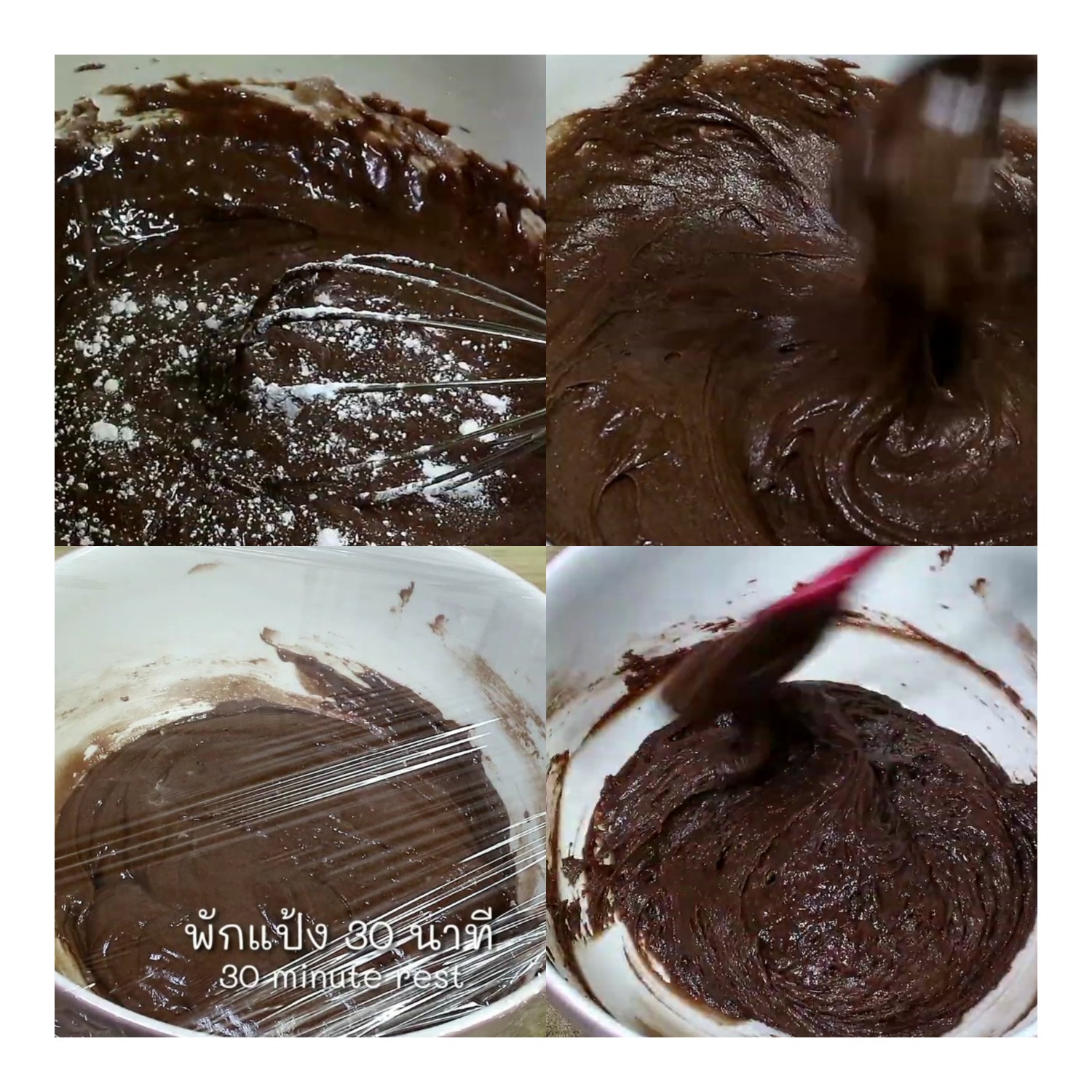 4.ร่อนแป้งและผงฟูรวมกัน แบ่งผสมในของเหลวคนจนแป้งละลายพักแป้งไว้30นาที