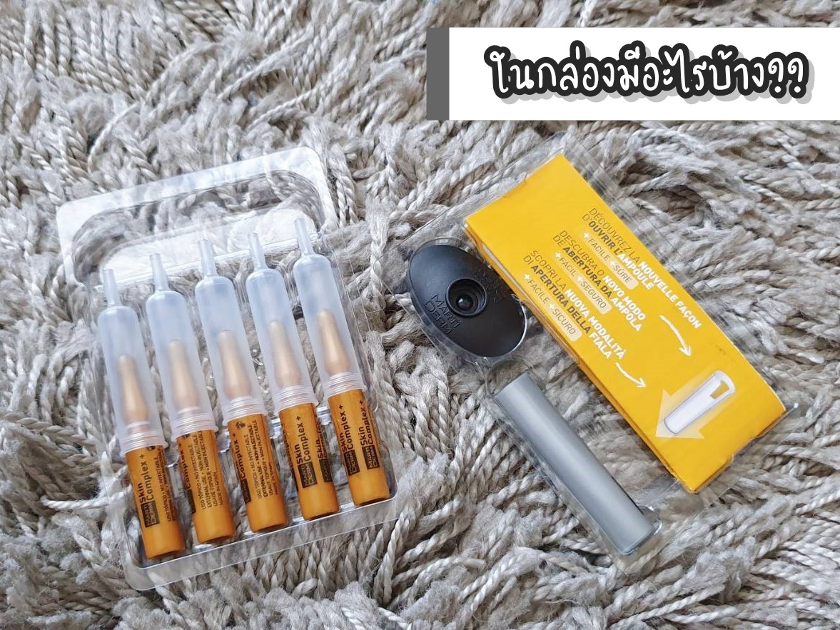 ในกล่องจะมีหลอดแอมพูล ขนาด 2 ml 10 ขวด พร้อมอุปกรณ์เปิดหลอดแอมพูล ฐานรอง และจุกปิดค่ะ