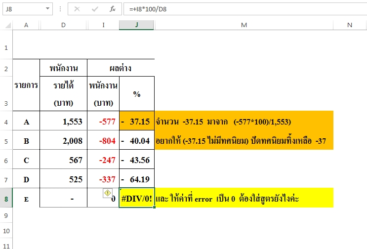 ตารางในช่อง % ใช้สูตรเดียวกันค่ะ แต่ รายการ E ไม่มีตัวหาร เลยขึ้นแบบที่เห็น