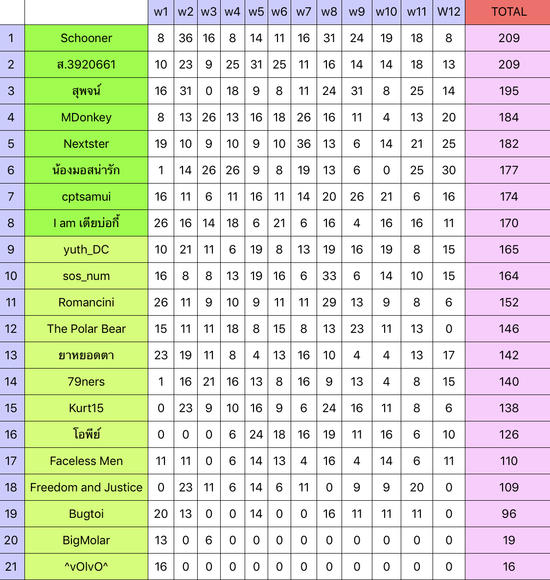 ผู้ที่ทำได้คะแนนสูงสุดในอันดับคะแนนรวมมีเท่ากันสองท่าน ได้แก่คุณSchooner และคุณสมาชิกหมายเลข3920661 ได้ท่านละ209 คะแนนครับ