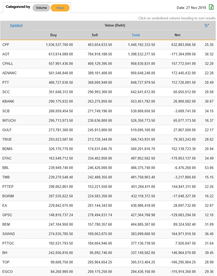 นักลงทุนต่างชาติ NVDR ซื้อ-ขาย มูลค่าสูงสุด 25 อันดับ 27/11/62
